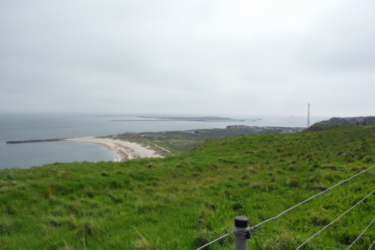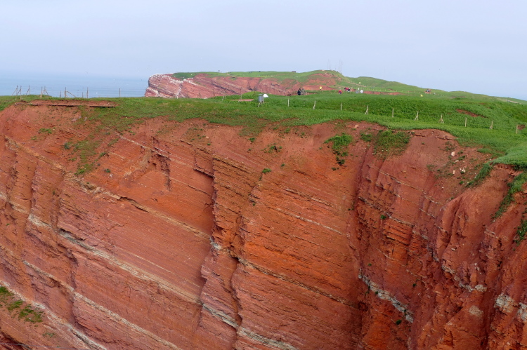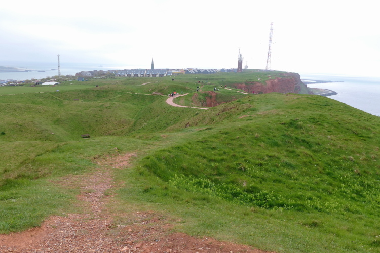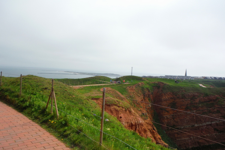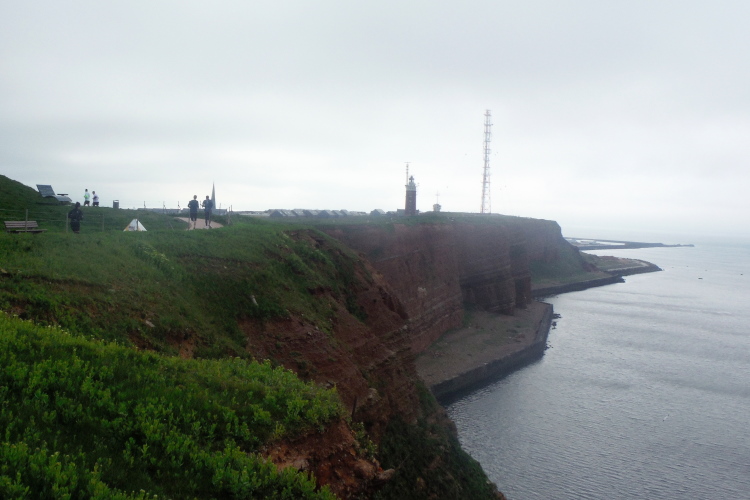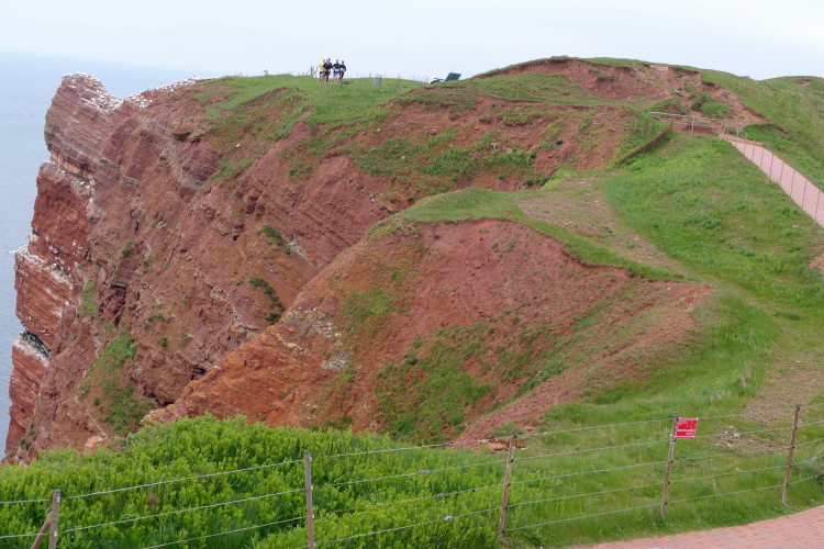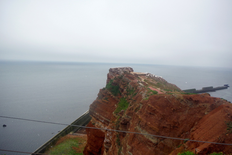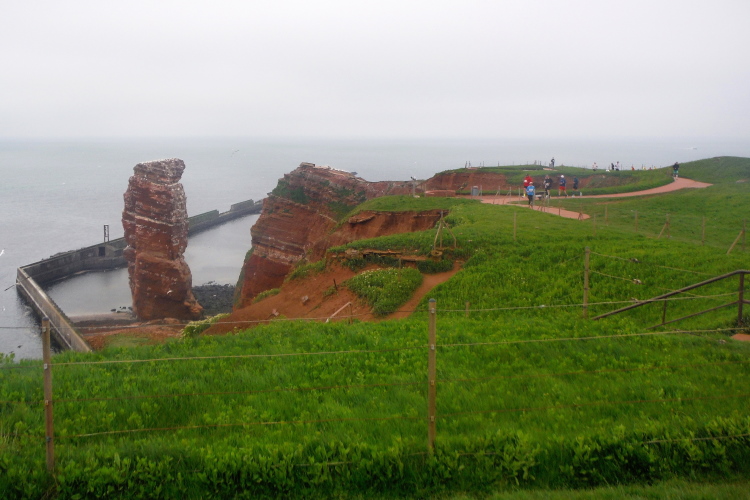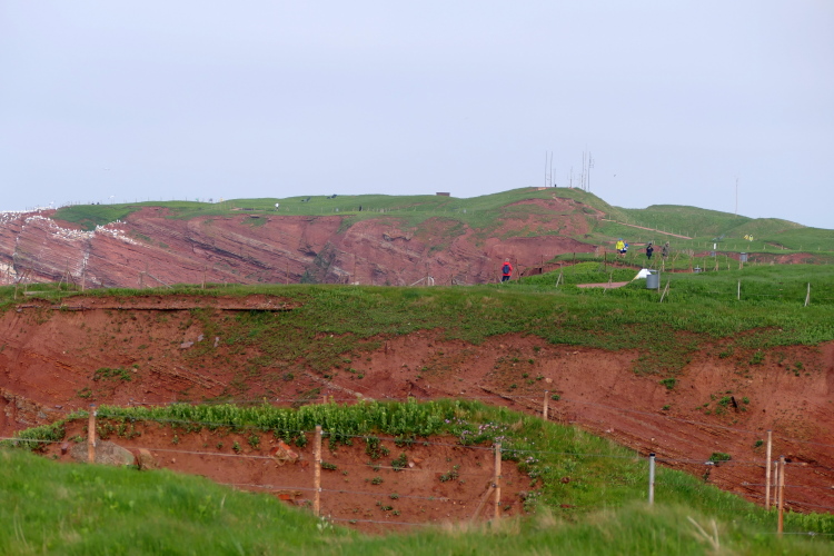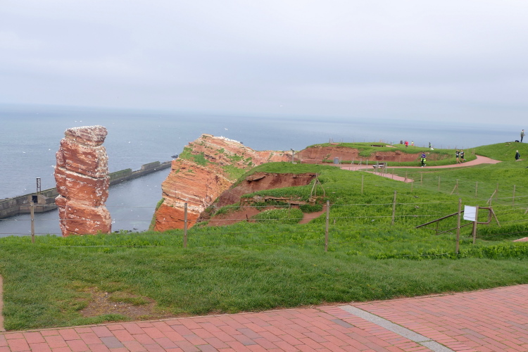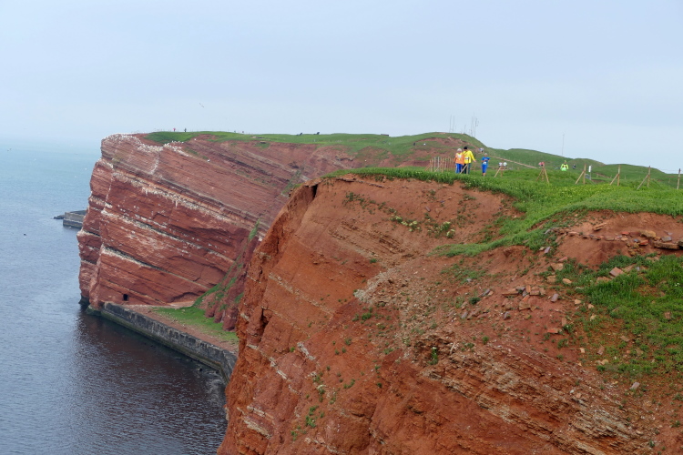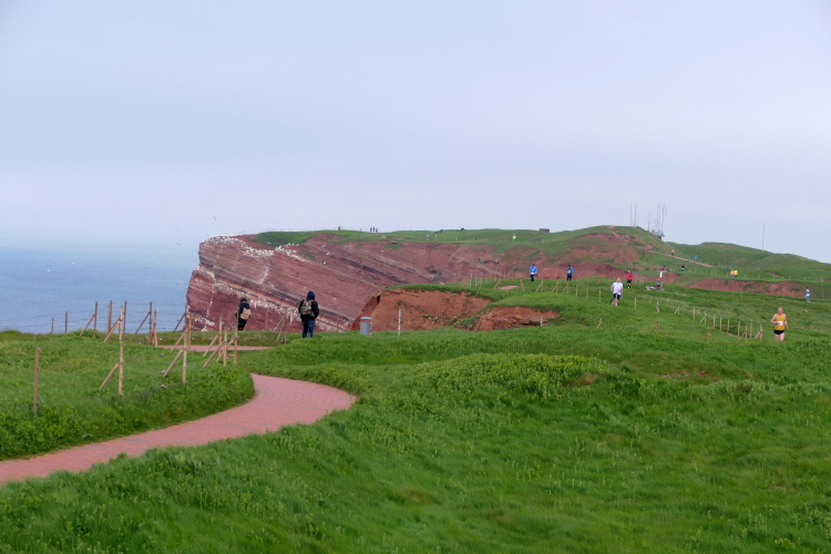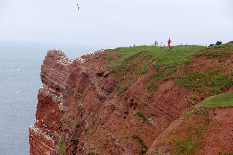 Wir folgen den gelben Pfeilen, die uns sicher um die Insel leiten. Zum ersten Mal geht es gleich zu Anfang den sogenannten Düsenjäger hinauf, 30 Höhenmeter sind auf kurzer Distanz zu überwinden. Wird morgen eine große Herausforderung. Nach Erklimmen der Hummerklippen führt die Strecke entlang des Klippenrundweges. Höhepunkt ist die Aussicht auf die lange Anna und die zahlreich nistenden Basstölpel und Lummen.