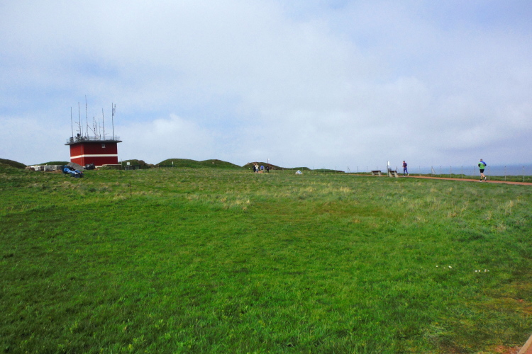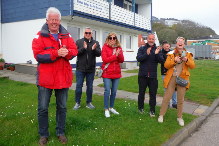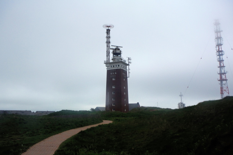 Zum dritten Mal erklimme ich den Düsenjäger, wobei ich mich an Elke und Mike halte. „Bunte Socken und rote Köpfe“, wird uns zugerufen. Wir müssen schmunzeln. So lässt es sich locker weiter laufen, auch über das wellige Profil des Oberlandes. Nach dem Richtungswechsel an der langen Anna erwartet uns erneut frischer Wind. Voraus der Leuchtturm, der im letzten Weltkrieg als Flakturm diente und als einziges Gebäude auf Helgoland die Bombardements vom April 1945 überstanden hat. Kurz umrundet fliegen wir erneut den Weg zum Hafen hinunter.