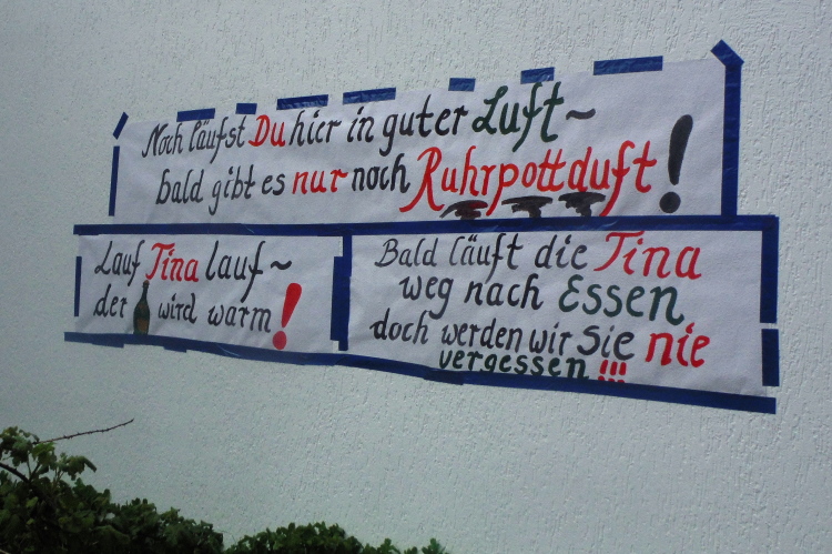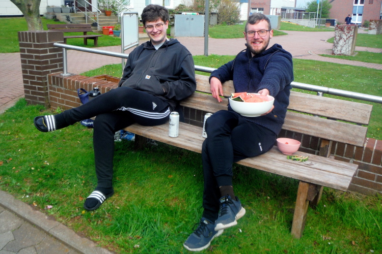 Die Pfade sind bekannt, einen Verlaufen jetzt nicht mehr möglich. So kann ich mich meinen Gesprächspartnern widmen, solange ich immer wieder aufschließen kann. Der Düsenjäger zum zweiten wird laufend bewältigt. Kurz vor dem Verpflegungspunkt an der Schule wartet eine Privatinitiative mit frischen Stücken Melone. Da greife ich doch gerne zu.