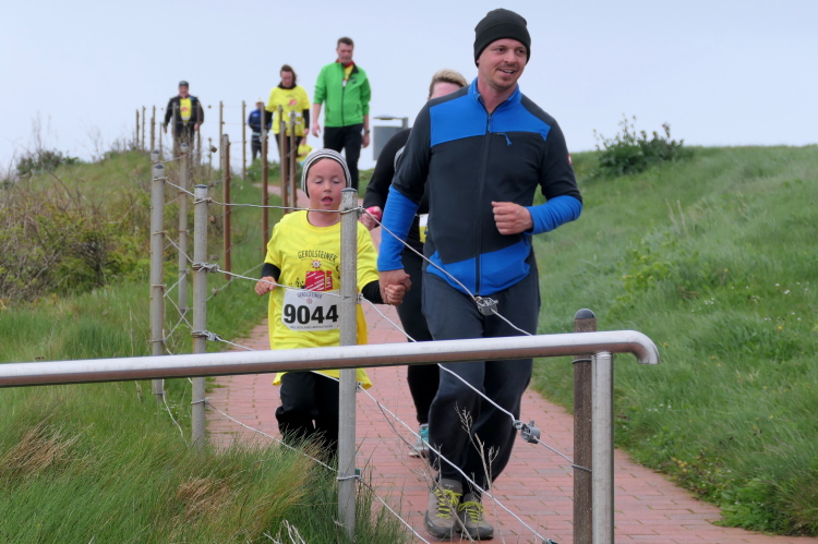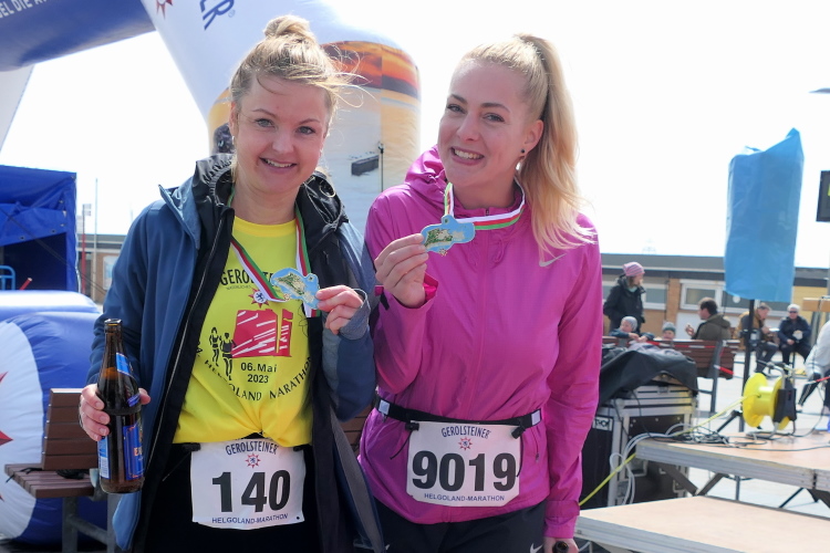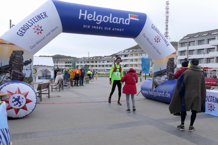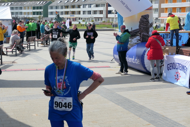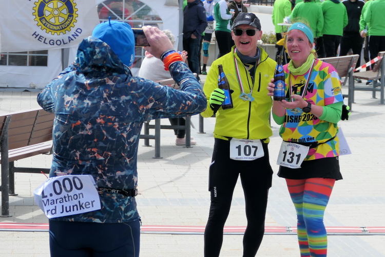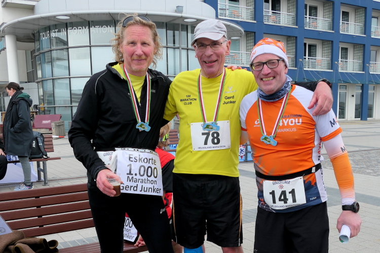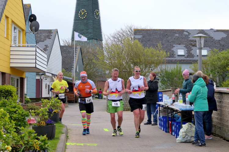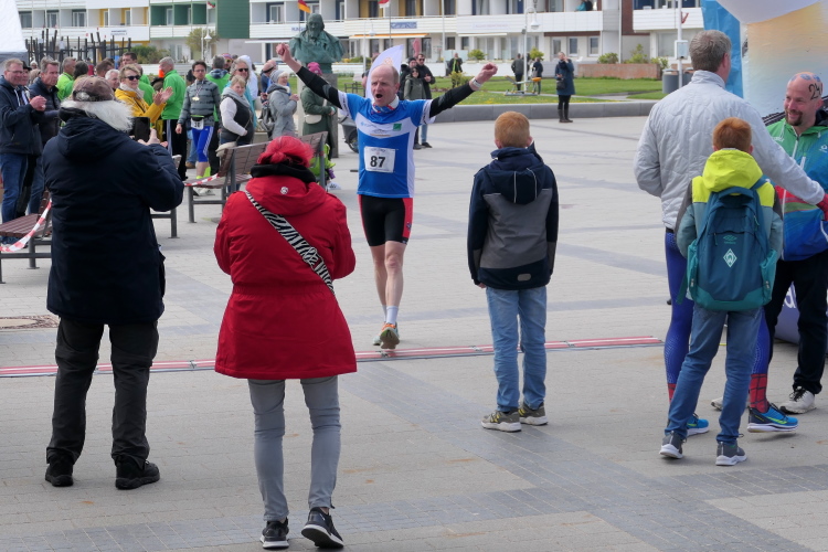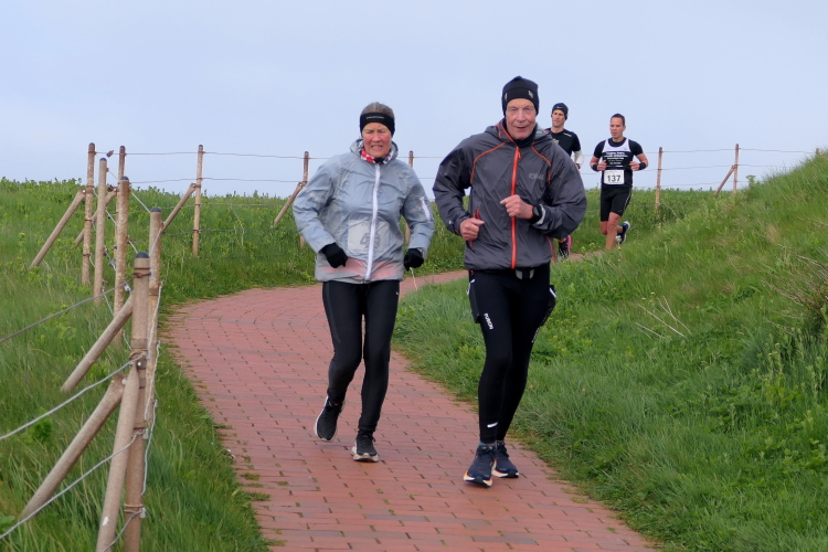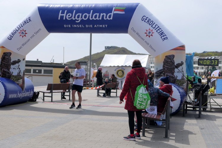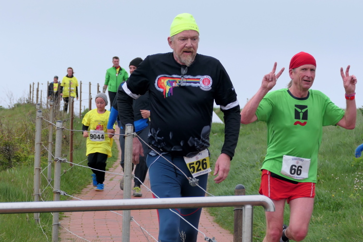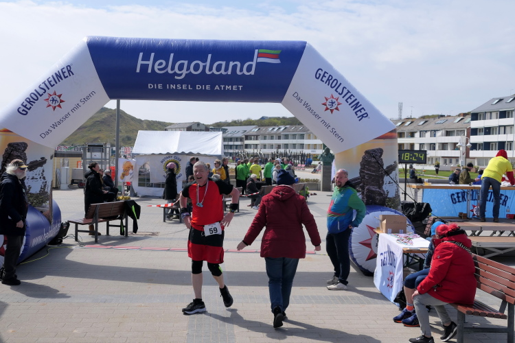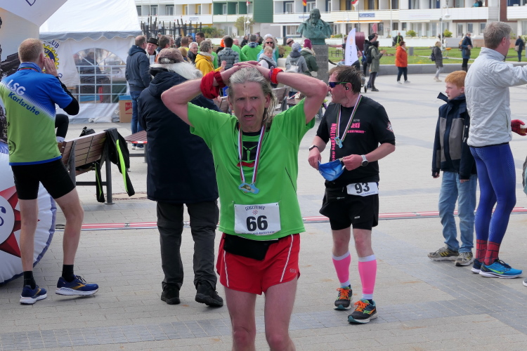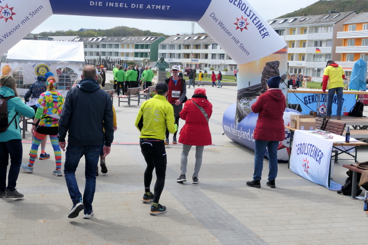 Ich habe Zeit für die Zielverpflegung und den prompten Ausdruck meiner verdienten Urkunde. Die Medaille, geschmückt mit der Insel und der heutigen Strecke, habe ich da längst am Hals baumeln. Nur auf Gerd muss ich noch ein paar Minuten warten. Trotz auffrischendem Wind mache ich das gerne, denn so ein Jubiläum erlebt man selten. Da nutze ich die Gelegenheit, gleich nach Gerds Zieleinlauf zu gratulieren, nicht ohne entsprechend beeindruckt von seiner Leistung zu sein. Nicht nur deswegen hat der heutige Lauf einen tiefen Eindruck bei mir hinterlassen. Die gute Organisation und das Ambiente laden dazu ein, wiederzukommen, wahrscheinlich schon zum Silberjubiläum im nächsten Jahr.