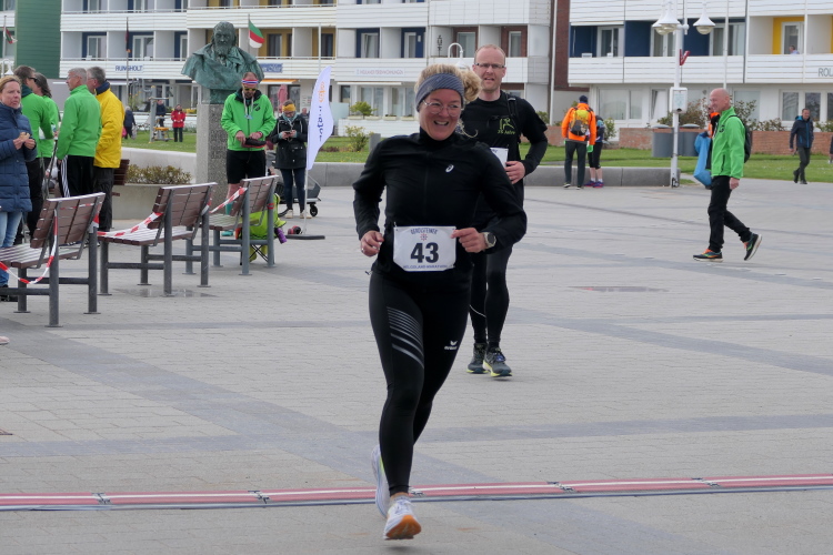 Ich genieße den Wind in den Haaren, lasse mir noch Zeit, ein paar Lauferfahrungen auszutauschen. An der letzten Verpflegungsstation gönne ich mir jetzt ein Bleifreies, denn zum Ziel habe ich nicht einmal mehr einen Kilometer zurück zu legen. Locker ein letztes Mal die Beine in die Hand nehmen, vorbei an den bunten Hummerbuden. Der Zielbogen kommt in den Blick, Silke wartet dahinter und schon habe ich den Lauf erfolgreich beendet.