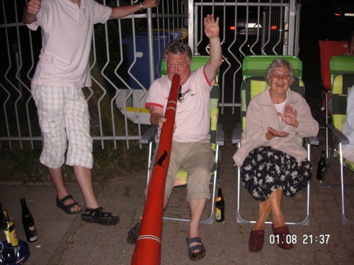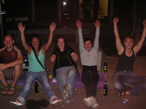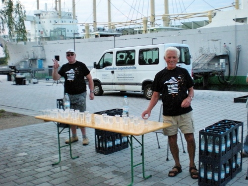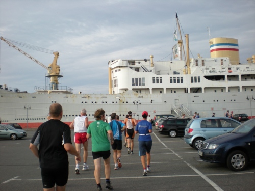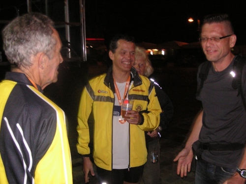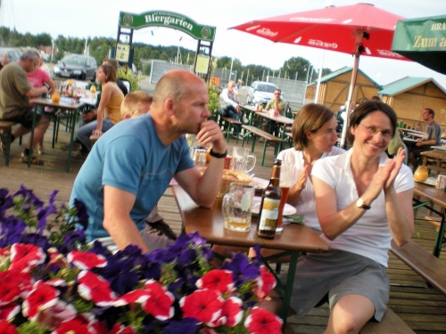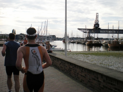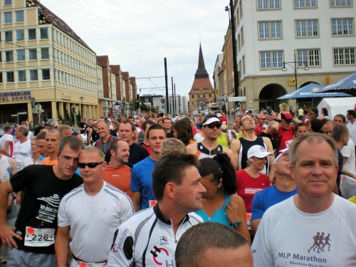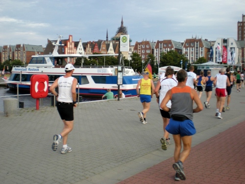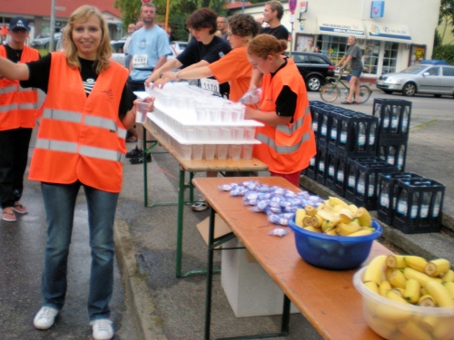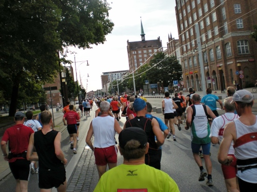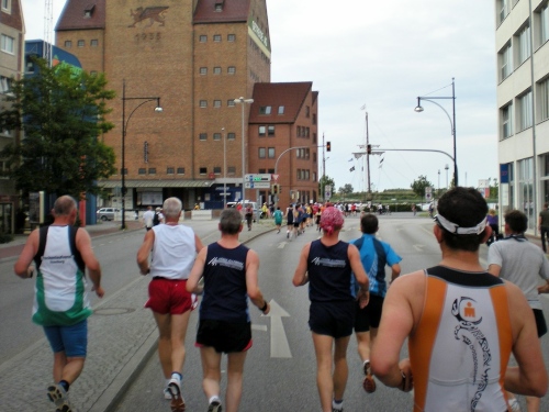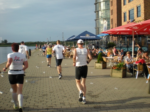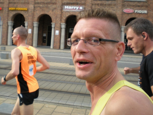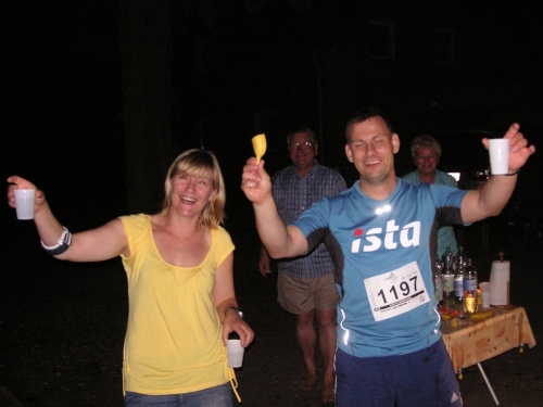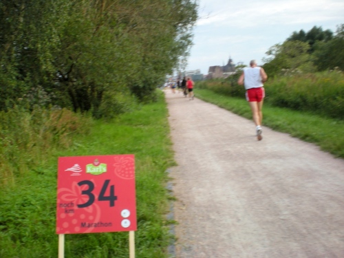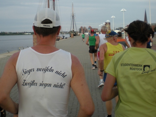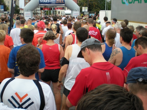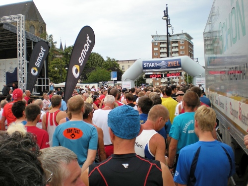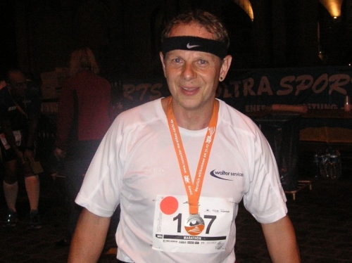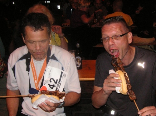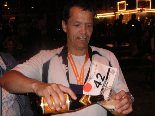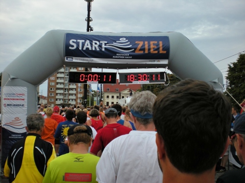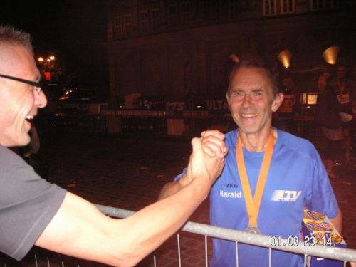 Und so sitzen wir im Zielbereich, trinken Bier und warten. Wo bleibt Horst nur? Der läuft doch locker nen Marathon unter 4:30! Die Jungs am Computer sind auf Zack! Die wissen: 2 Läufer sind noch unterwegs, einer davon ist Horst! Wir gehen zum Zieltor. Die Zeiger der Rathausuhr springen auf 24 Uhr. Der Horst will in seinen Geburtstag hineinlaufen, das ist klar!