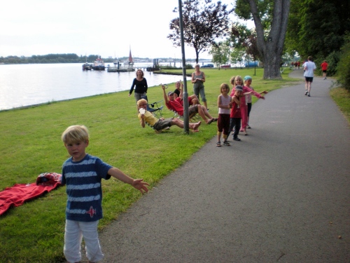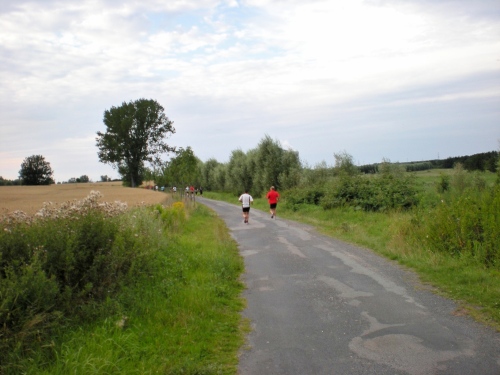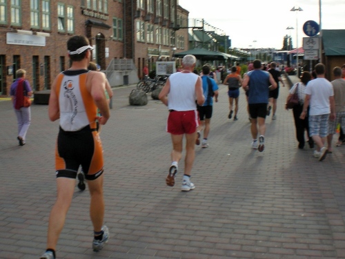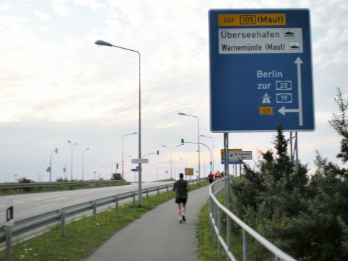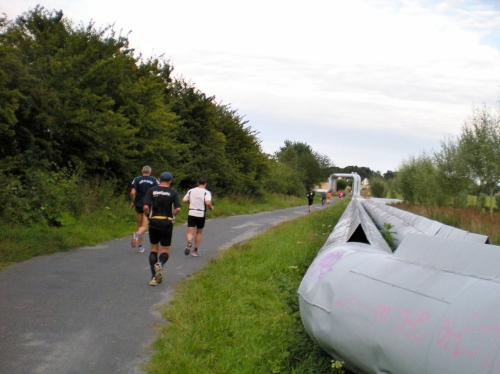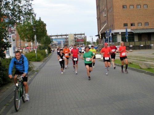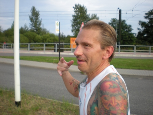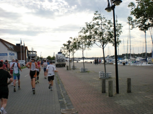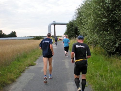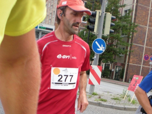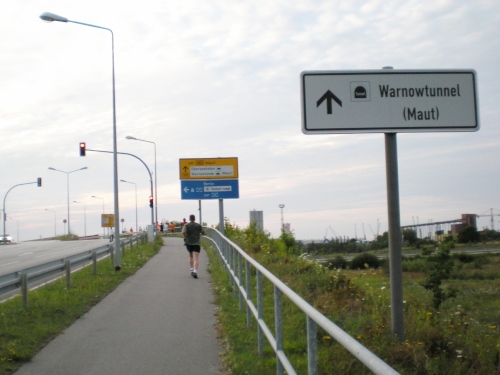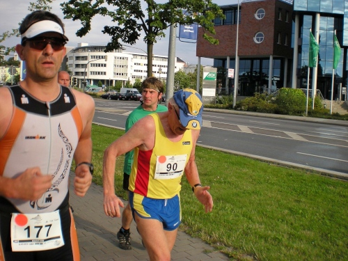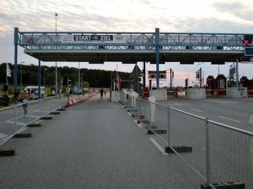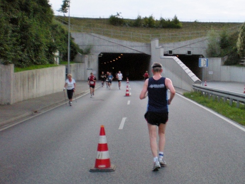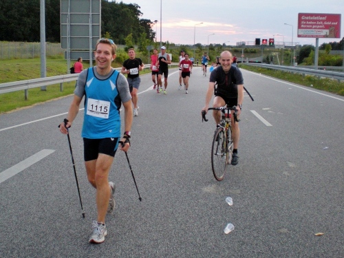 Ja und dann kriege ich den Stöckchenschwinger und Seriensieger Mathias Ahrenberg vor die Linse, wie er aus dem Tunnel hervorwatschelt - hahaha! Was für ein Anblick. Startnummer 1115! Sein Wettgegner Stephan auf dem Fahrrad (selbst exzellenter Läufer) überwacht, daß auch ja je ein Fuß auf dem Boden bleibt.