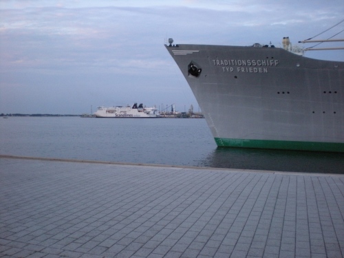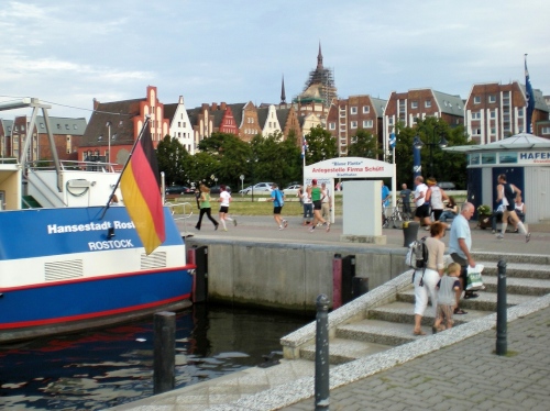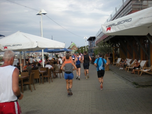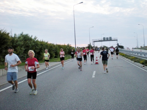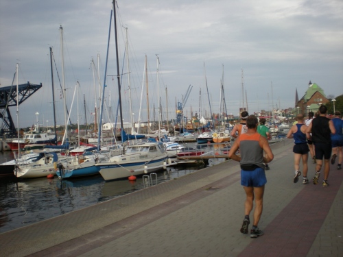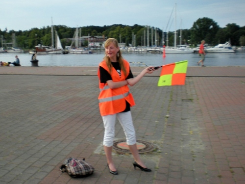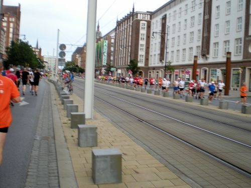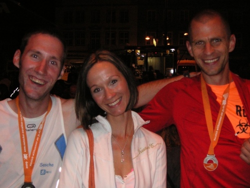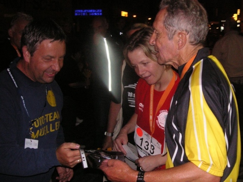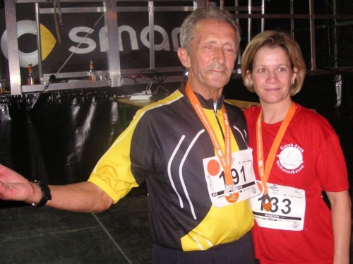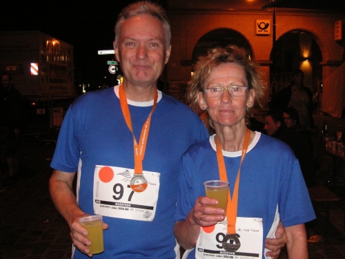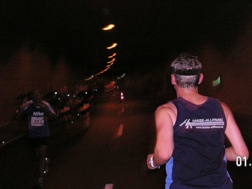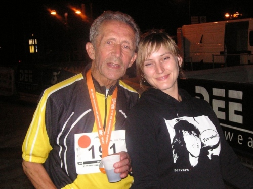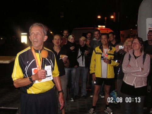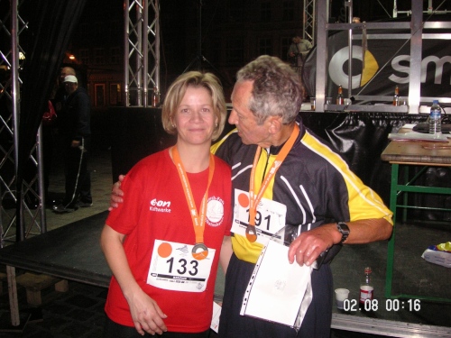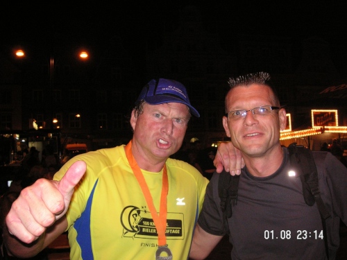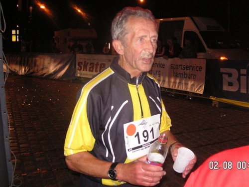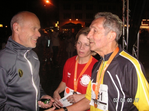 Ich erwarte, daß er wie bei „Zürück in die Zukunft“ mit Blitz und Donner von der Rathausuhr heruntergerauscht kommt. Aber wo bleibt er nur? Horst hat jetzt seinen 74ten Geburtstag! Mehr als 5:30 Std? Was macht er denn nur? Ein Raunen geht durchs müde Restpublikum! Saskia ist die zweite Person auf der Strecke! 34 Jahre jung und bildhübsch, 4ter Marathon! Was macht der junge Horst da nur so lange? Blaulicht wird sichtbar, kein Besenwagen, sondern Polizeieskorte. Und dann kommt er endlich aus dem Dunkeln ins Scheinwerferlicht. Horst, ein Offizier und Gentlemen läuft Hand in Hand mit Saskia durch Zieltor.