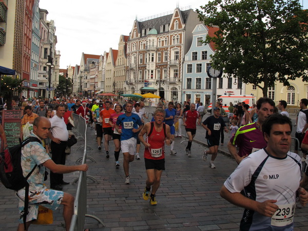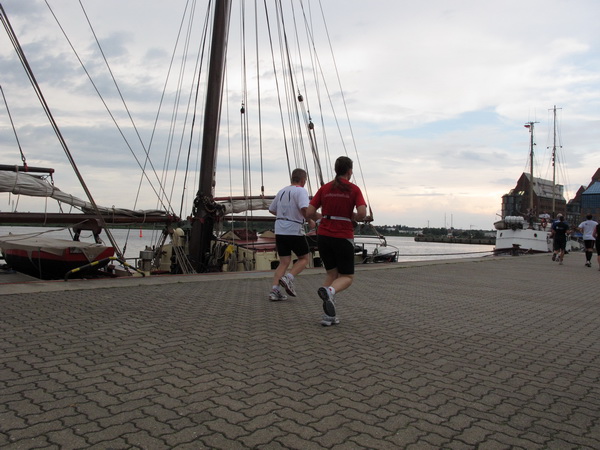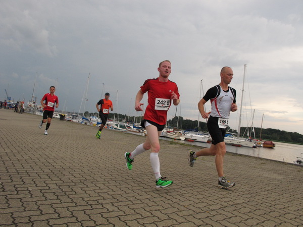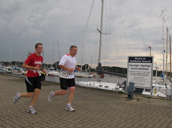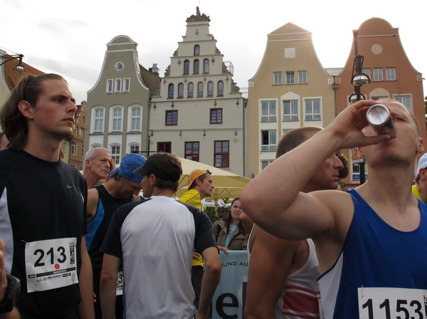 Bis zum Start um 18.00 Uhr ist von der Abkühlung nicht mehr viel zu spüren. Es ist schwül und ich muss noch unbedingt was trinken. 1484 Anmeldungen registrierte der Veranstalter, aber nur etwa 200 entfallen auf den Marathon. Über 800 Halbmarathonläufer starten um 20.00 Uhr auf genau halber Strecke am Warnowtunnel. Eine Besonderheit ist der Staffel-Marathon. Gleich 8 Läufer teilen sich die Distanz. Die Wechselstellen werden alle per Schiff angefahren.