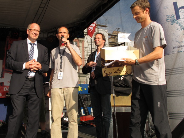 Am Nachmittag ziehen dunkle Wolken auf. Prima, das eigentlich für den Abend vorhergesagte Gewitter entlädt sich noch rechtzeitig vor dem Start. Regen, Blitz und Donner zaubern deshalb allen ein Lächeln auf das Gesicht. Nach 30 Minuten ist der Neue Markt frisch gewaschen, gleichzeitig hat es ein klein wenig abgekühlt.