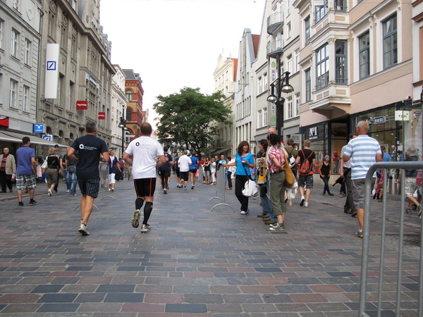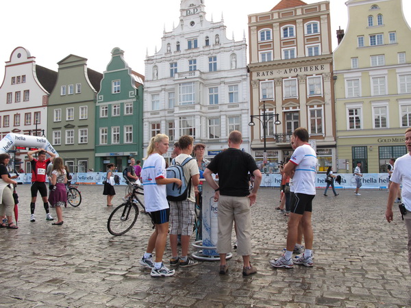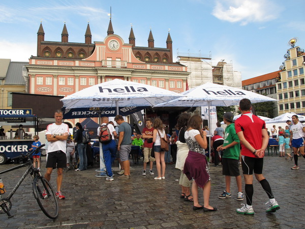 Am Samstag ist der Sommer zurück. 30 Grad und es ist schwül. Ohne dass man sich viel bewegt, fließt der Schweiß. Der Veranstalter macht sich Sorgen und plant weitere Erfrischungsstationen ein. Ich mache mir auch Sorgen und verkürze meine kleine Besichtigungstour durch Rostock. Die Hansestadt ist mit über 200.000 Einwohnern zwar die größte Stadt in Mecklenburg-Vorpommern, aber vom Marathon-Zentrum am Neuen Markt erreicht man leicht einige Sehenswürdigkeiten, die etwas über die Stadt und ihre Geschichte erzählen.