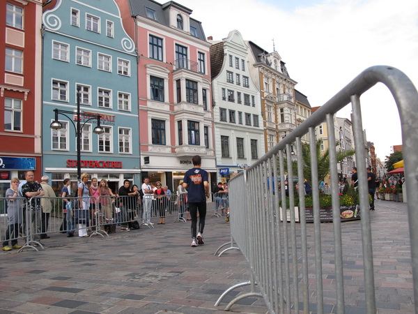 Schön ist, dass man auf der neuen Strecke etwas von der Stadt zu sehen bekommt – und das gleich doppelt. Die kleine Runde durch die Innenstadt, über den Universitätsplatz, der früher Hopfenmarkt hieß und der Marktplatz der Neustädter war, vorbei am Kröpeliner Tor aus dem 13. Jahrhundert, eines der vier Stadttore von Rostock, läuft man nämlich zweimal. Viele Zuschauer verfolgen hier das Rennen.