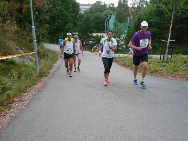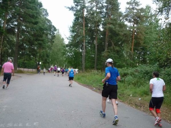 Nach Kilometer 33 überqueren wir wieder die Autobahn über die Brücke, nun aber ändert sich der Kurs des Hinweges. Es geht bei der 15km-Gabelung nach Norden auf einer kleinen Brücke hinüber zur Schäreninsel Kaskisaari und weiter nach Lehtisaari. Die Gegend wirkt auf mich recht einladend, viel Grün und Wasser um einen herum. Bei Kilometer 36 mündet der Kurs in die schon gelaufene Strecke. An der nun folgenden Labestelle werden Gelpäckchen verteilt, ich nehme mir gleich mehrere für die nächsten Läufe.