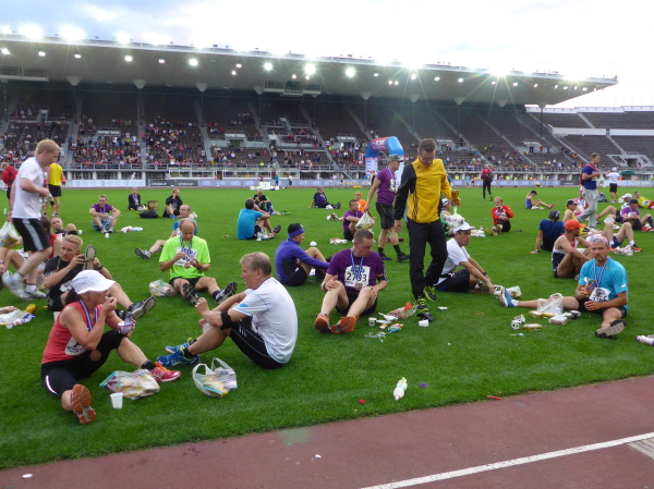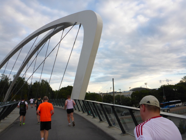 Nach den zahllosen kleinen Steigungen der Strecke verlangt der Hügel im Laakso-Park die letzten Reserven, dann geht es hinein ins Olympiastadion (1952) zum Maali, dem Ziel. Die Runde im lichtdurchflutenden Stadion vertreibt mir an diesem Abend die letzten Zweifel, ob meine operierte Achillessehne halten wird. Ich bin zurück. Das Leben geht endlich weiter! Die Scheinwerfer sind nur für mich! Herrlich, ich habe gesiegt!