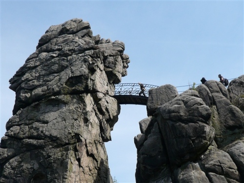 Elke und ich reisen bereits am Vortrag an, besuchen die von der Erosion freigelegten, sehenswerten Externsteine in der Nähe, übernachten im nahe gelegenen Bad Driburg und verbringen mit unseren Freunden Silke und Markus einen angenehmen Samstag. Markus ist den Hermann schon ein paar Mal gelaufen, hat aber diesmal keinen Startplatz mehr bekommen. So frönt er der Regeneration nach dem Obermain-Marathon und übernimmt in diesem Jahr die Führung meines persönlichen Fanblocks, bei zwei Frauen Herausforderung genug.
