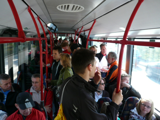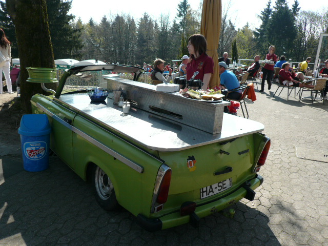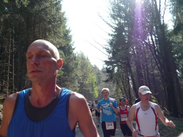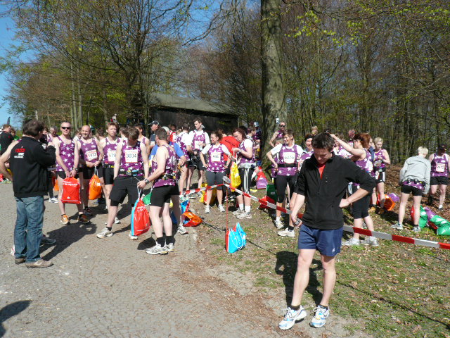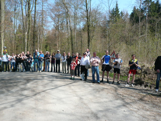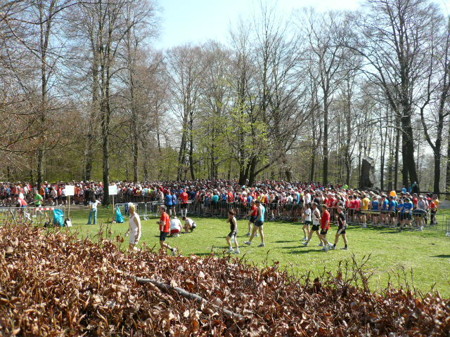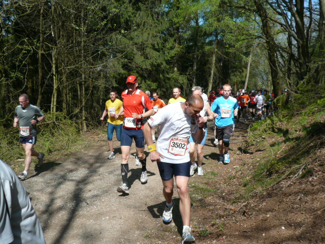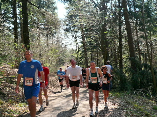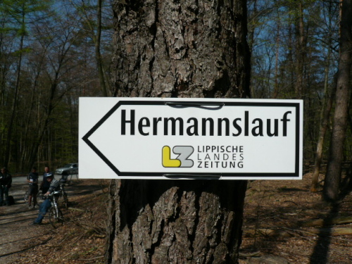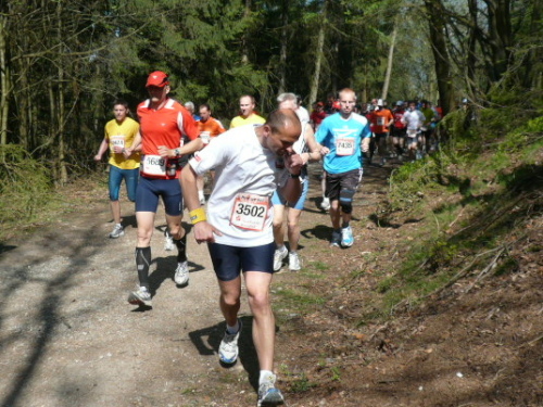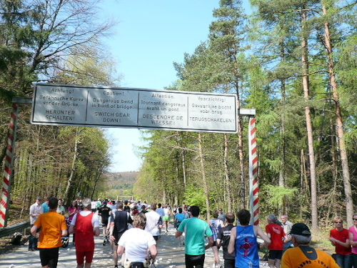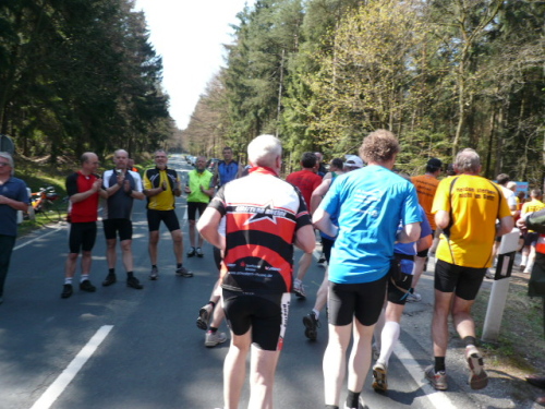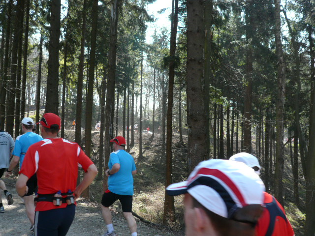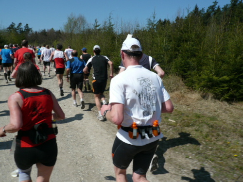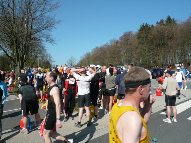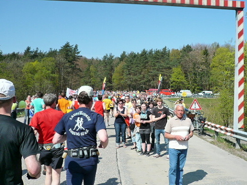 Oben auf dem Großen Ehberg angekommen, werde ich durch 80 Bergabmeter belohnt. Und dieser ständige Wechsel zwischen Auf und Ab wird sich im weiteren Verlauf der Strecke bis zum Ende fortsetzen. Wohl dem, der regelmäßig in hügeligem Gelände unterwegs ist! Ab etwa km 8 passieren wir den Truppenübungsplatz Senne bei Augustdorf über eine breite Panzerstraße, deren Art mir aus alten Zeiten beim Barras, meist aus der Kommandantenluke, wohl vertraut ist. Am Anfang schon die zweite Wasserstelle und wenig später die erste „richtige“ Verpflegungsstation. Angeboten werden temperiertes Wasser ohne Kohlensäure, Tee, Apfel-, Apfelsinen- und Bananenstücke. Die Anfeuerung ist riesig, Tour-de-France-Gefühl pur. Als Rheinländer dachte ich bisher immer, die Westfalen seien alle so wie Rüdiger Hoffmann: Paderborn, „ja, hallo erst mal“ und so, Ihr wißt schon. Nichts dergleichen, die sind tatsächlich quicklebendig! Um nicht zu sagen: Hier ist die Hölle los!
