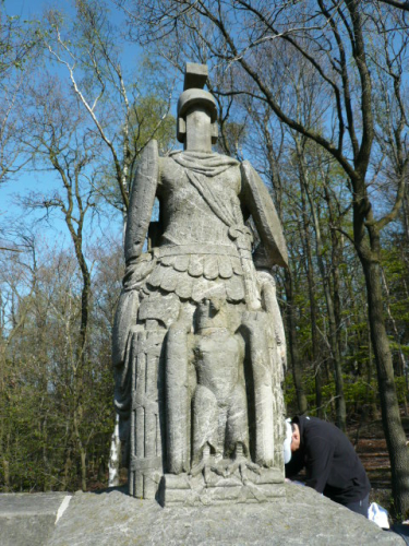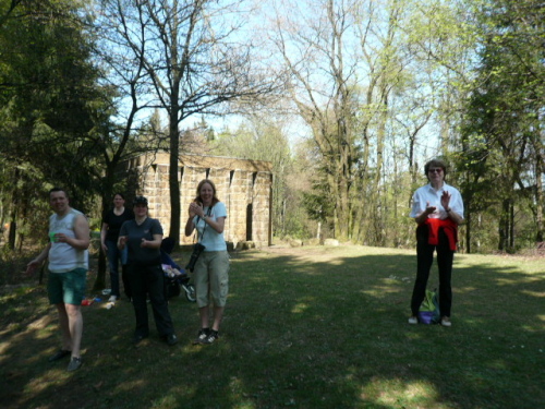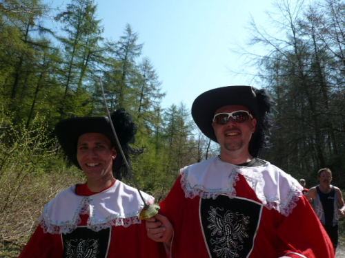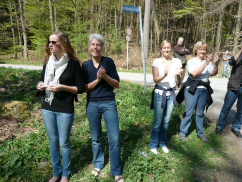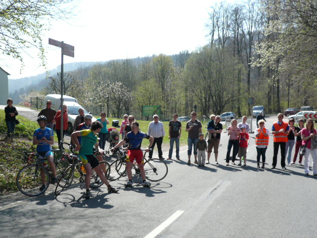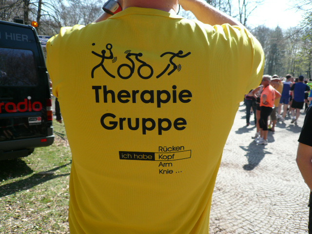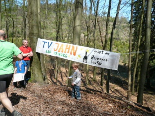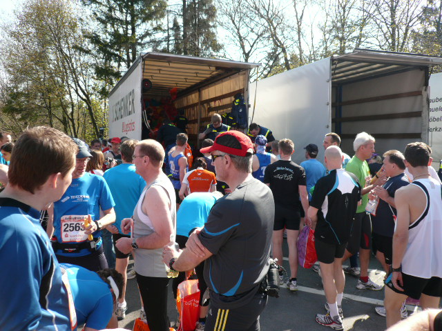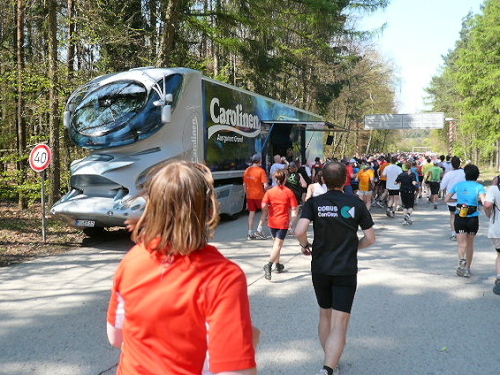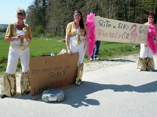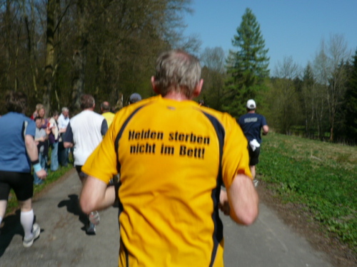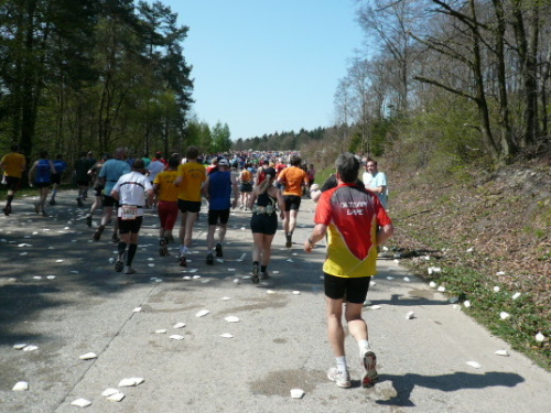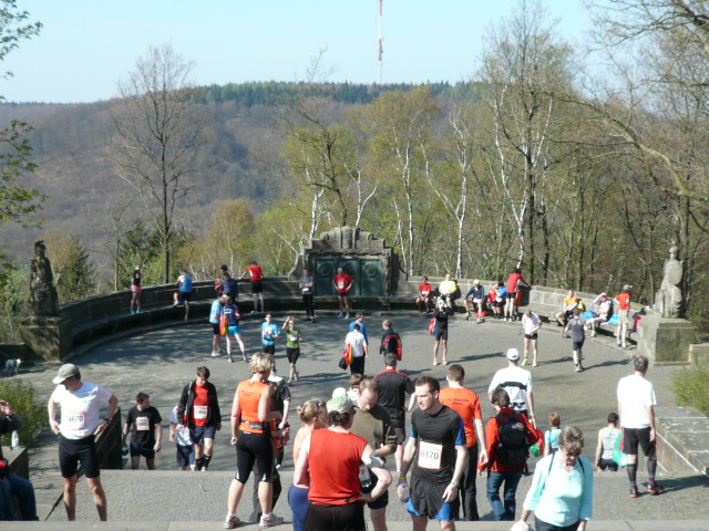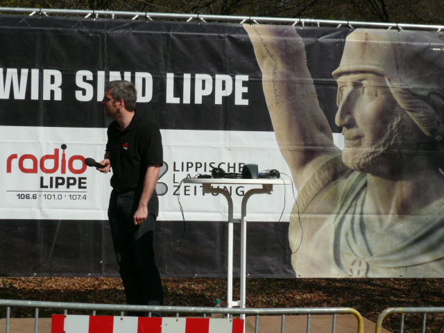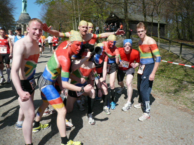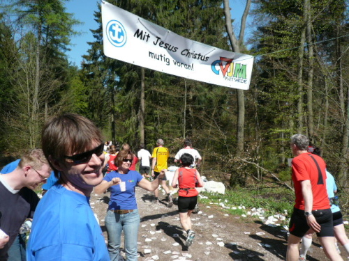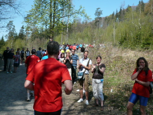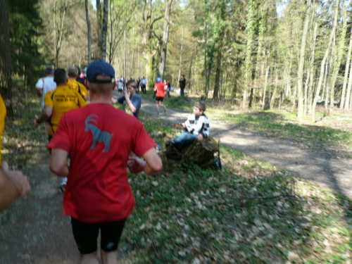 Etwa an km 5, vorher hat es schon das erste Mal außerplanmäßig Wasser gegeben, steht zum ersten Mal mein bestelltes Jubelkommando inkl. meiner Thusnelda. Das ist jetzt ausnahmsweise mal nicht frauenfeindlich, sondern der Name der Ehefrau unseres germanischen Helden. Ich wundere mich über die doch schon vergleichsweise zahlreichen Zuschauer, aber das sollte nur der erste, zarte Anfang sein.