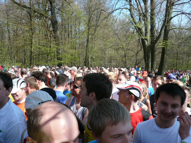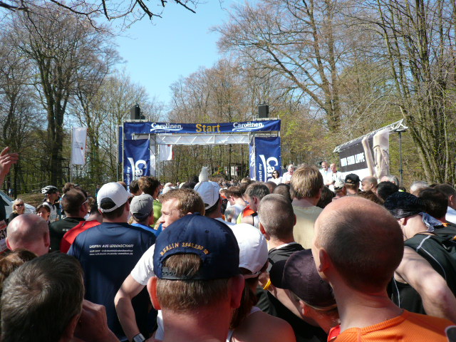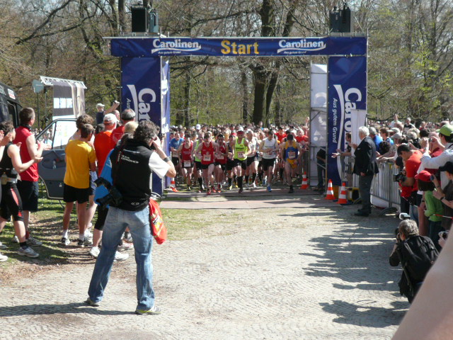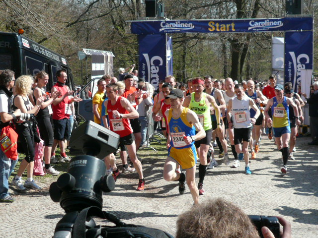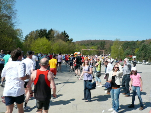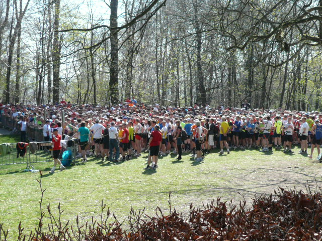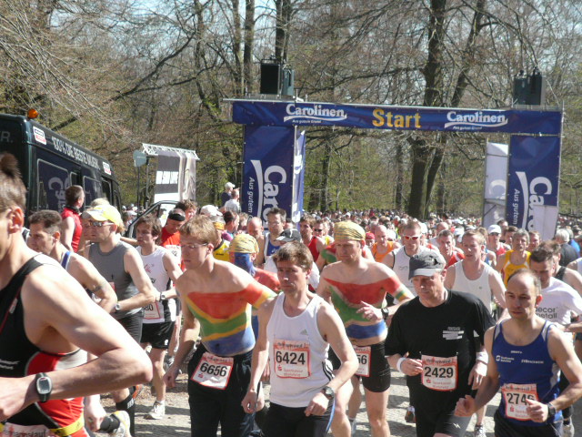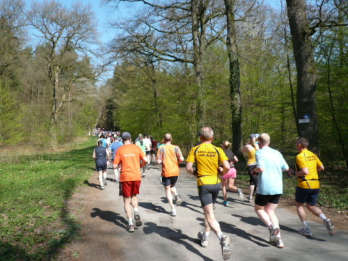 Überrascht bin ich, schon seit km 4 mehr und mehr zu überholen. Insbesondere etliche junge Frauen mit teils beeindruckenden eingelagerten Energiereserven in der Körpermitte und den hinteren Extremitäten laufen so langsam, daß diese mit in der Gruppe B gestartet sein müssen. Das ist für diejenigen, die zügig laufen wollen, ein echtes Problem. Nicht jede(r) hat sich also passend zu seinem/ihrem Leistungsvermögen aufgestellt und das führt dazu, daß man permanent am Überholen, Querlaufen, Abstoppen, Anlaufen ist. Und das gestaltet sich bei der Enge der Wege häufig schwierig genug. Es muß leider deutlich gesagt werden: Die Strecke ist überfüllt, es sind zu viele Läufer unterwegs. Damit aber kein Mißverständnis entsteht: Die Route ist traumhaft schön, abwechslungsreich, zuschauerintensiv, einfach herrlich!