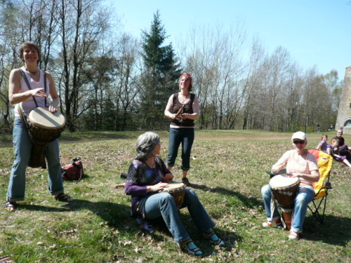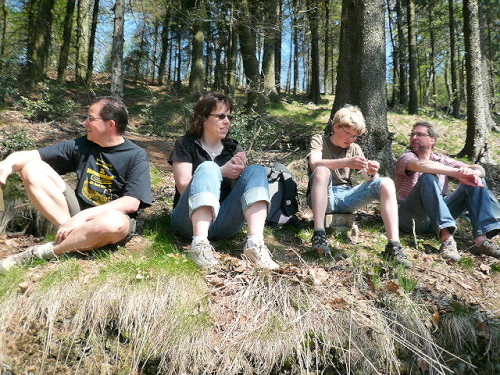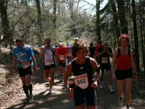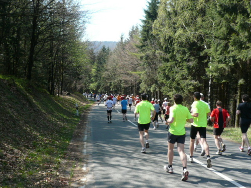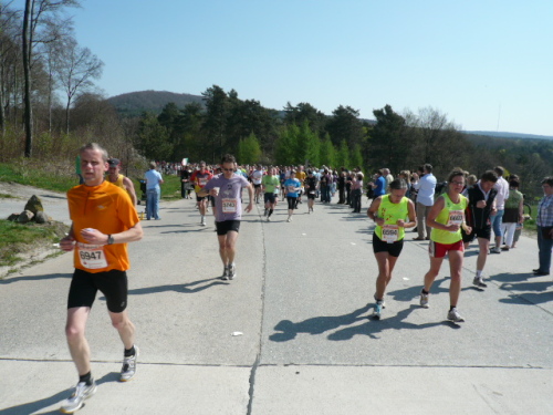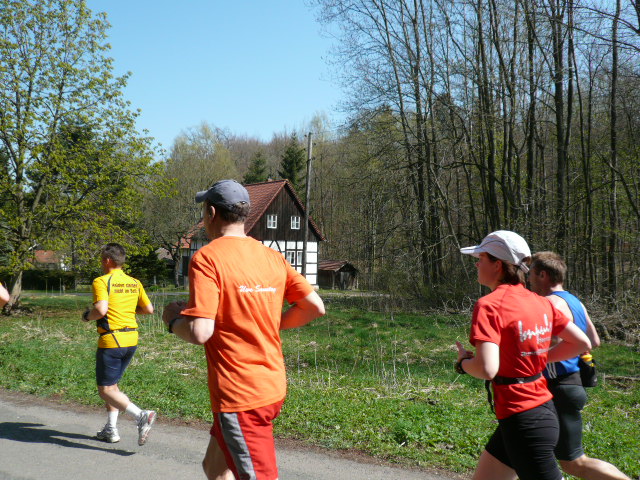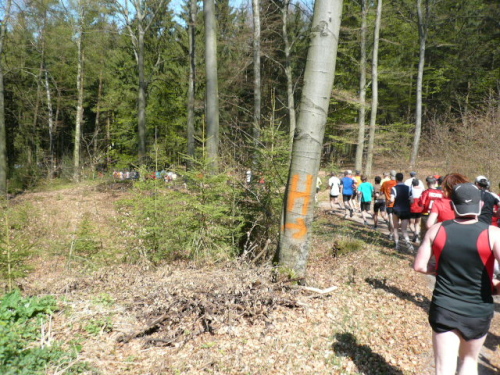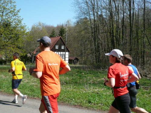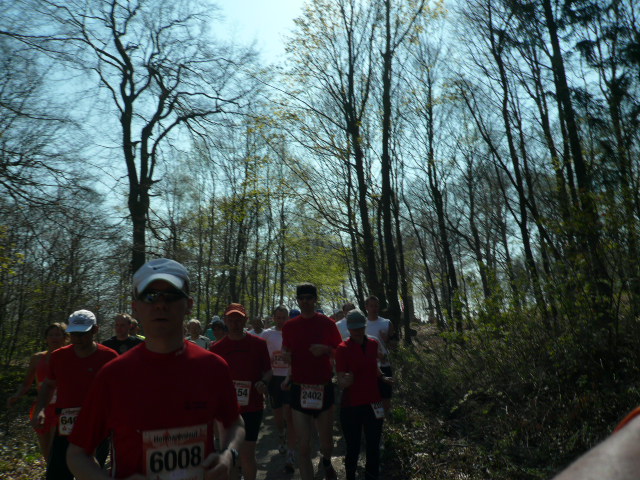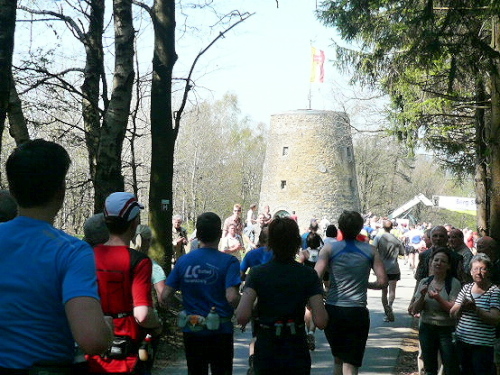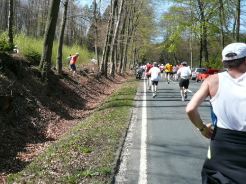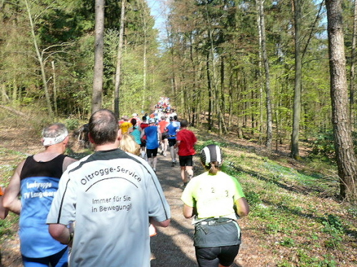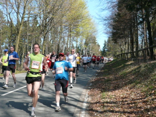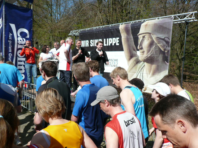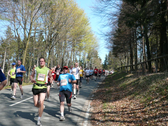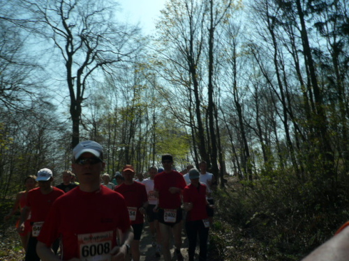 Ich registriere erfreut, daß ich inzwischen die Hälfte geschafft und somit im wahrsten Sinne des Wortes Bergfest habe und liege mit 1:25 Std. sehr gut in der Zeit, da kann ich nicht meckern. Wie gewonnen, so zerronnen: Wie wir uns nach oben geschleppt haben, geht’s jetzt wieder hurtig nach unten. Unterwegs wird noch bei 18,4 km zum dritten Mal (offiziell) Verpflegung aufgenommen und schon sind wir in Oerlinghausen. Landschaftsläufe habe ich ja schon viele mitgemacht, aber so etwas habe ich noch nicht erlebt: So klein das Dorf ist, so viele Zuschauer (natürlich auch wieder meine Fans) stehen hier auf einer gut beschallten Partymeile. Hier steppt der Bär! Da läßt sich auch das ansonsten unangenehme Kopfsteinpflaster ertragen. Viele laufen in den links und rechts davon verlegten Regenrinnen.