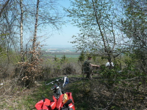 Die km zwischen 9 und 14 verlaufen, außer daß einige Abschnitte auf tiefem Sandweg zu überwinden sind, relativ undramatisch und eben. Viele, auch ich, nutzen die Gelegenheit, auf einem schmalen, parallel verlaufenden Waldweg mit festerem Untergrund besser voranzukommen. Aufgrund der Trockenheit der letzten Tage ist es sehr staubig, was aber das Laufen nicht behindert. Aber schwer warm ist es und es wird immer wärmer. Die folgenden 2 km bringen den für mich als schwierigsten empfundenen Anstieg zum Tönsberg. Zunächst gibt’s aber bei km 13,5 an der Stapelager Schlucht die nächste Atzung. Die Steigung jogge ich komplett hoch, viele sind bereits am Gehen und kämpfen heftig mit den rund 100 Höhenmetern, insbesondere am Ende. Belohnt werden jedoch alle mit einem wunderbaren Fernblick vom Tönsberg; dieses Bild kann die Kamera leider nur unzureichend einfangen.