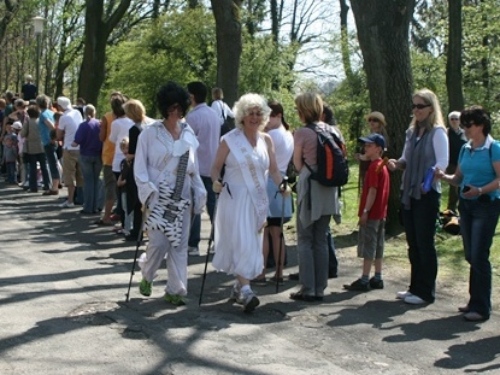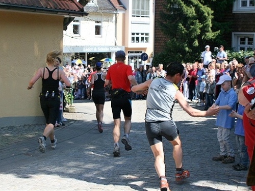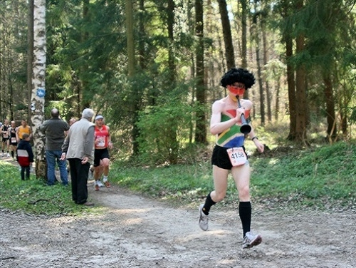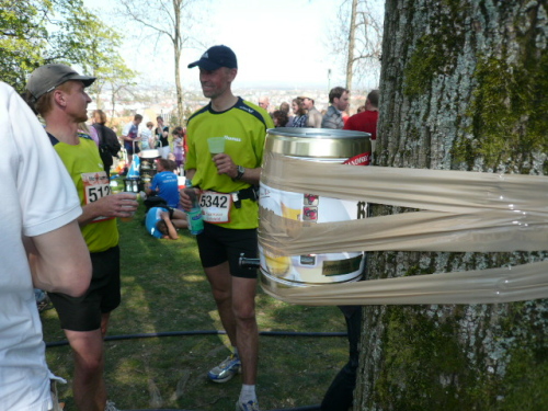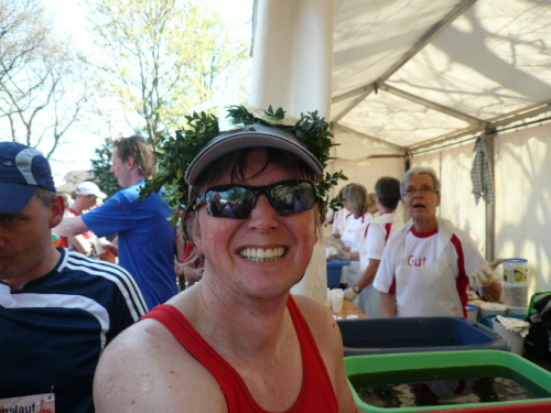 Einen weiteren Höhepunkt, so die Ausrichter weiter, erlebe der Läufer nach dem Zieleinlauf beim Empfang der Medaille. Das ist wohl normalerweise so, aber leider muß die ausgeschriebene Medaille diesmal nachgesandt werden, die sind nämlich vulkanausbruchbedingt irgendwo hängen geblieben. Zum Trost gibt’s ein Schokolädchen. Der Sieger und die Siegerin erhalten übrigens jeweils einen Siegerkranz. Nach der Ernährungserstversorgung (es gibt Wasser, Tee und Obst) kann man wählen, ob man sich direkt ins Getümmel der Bewunderer stürzt, erst den Kleidersack abholt oder eine Massage beansprucht.