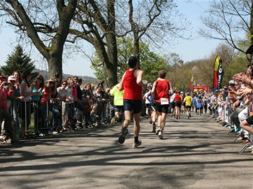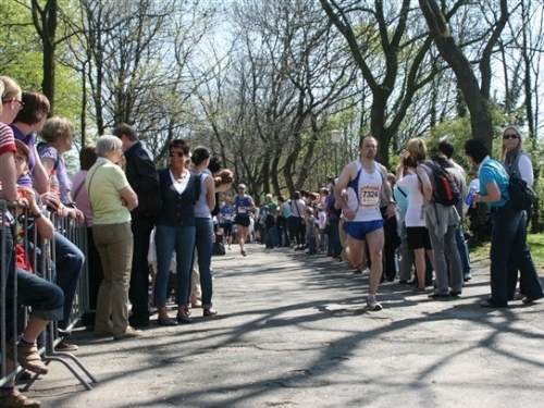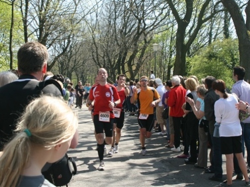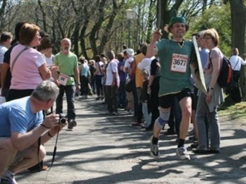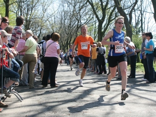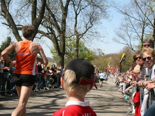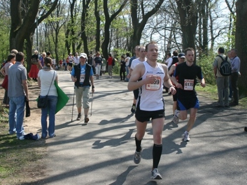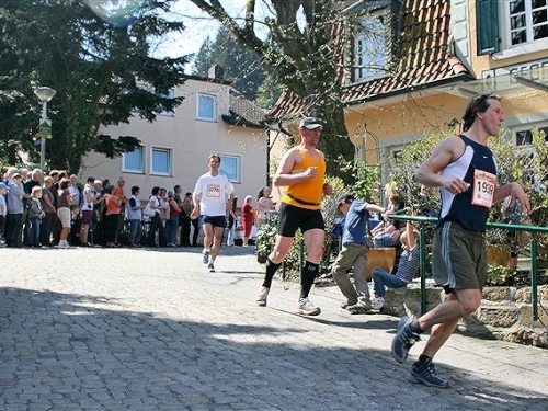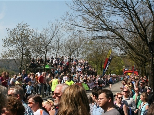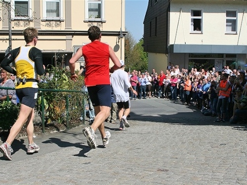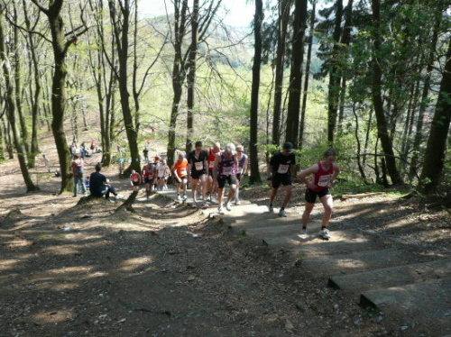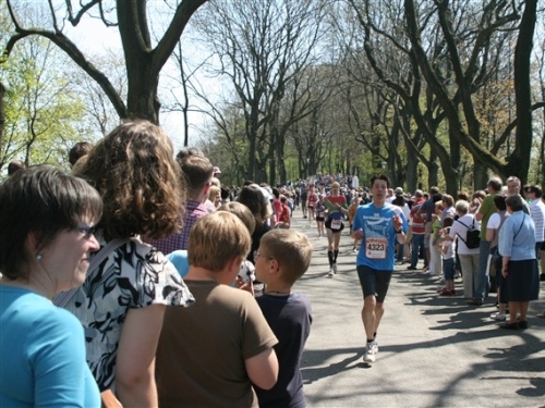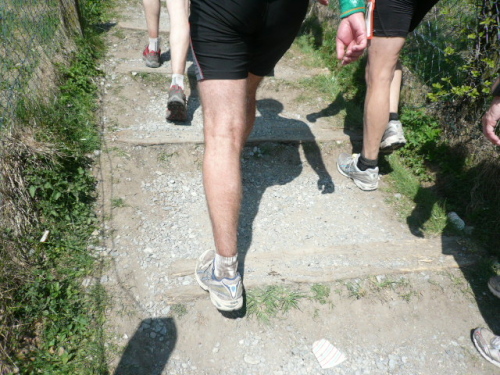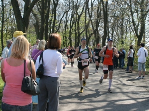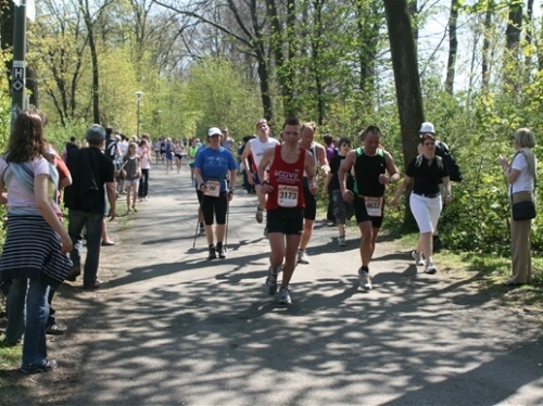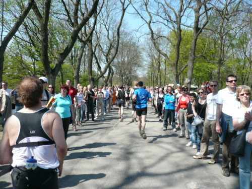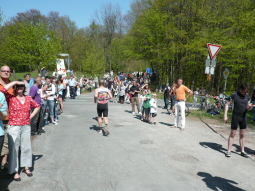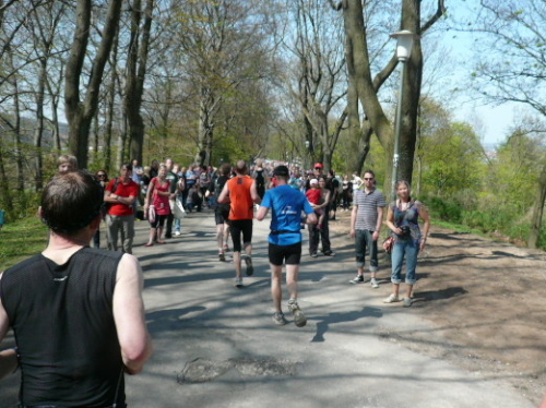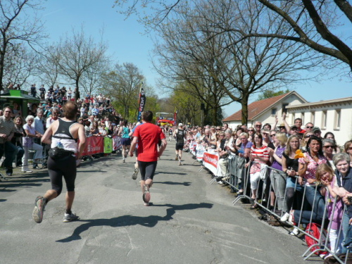 Nochmals kommen bei km 26 Treppenstufen, die einem jeglichen Schwung nehmen. Dies kann mich aber nicht bremsen. Spätestens seit den Hitzeläufen 2008 in Bad Pyrmont und untertage in Sondershausen ist mir klar, daß Heißluftlaufen mein Ding ist. Ich saufe zwar wie ein Kamel, aber es läuft supergut, ich bin trotz Fotografierens nur am Überholen und werde selber nur selten versägt. Ab den letzten drei km beginnt das Zuschauerspalier dichter zu werden.