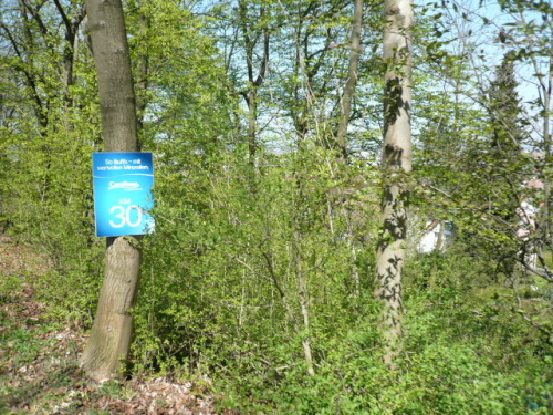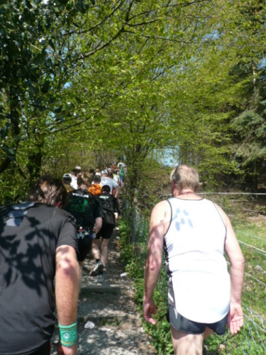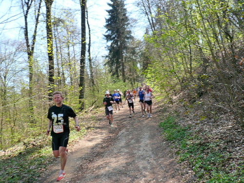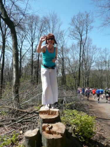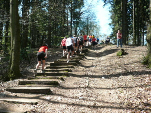 Für einen Udo hängen mehrfach Anfeuerungsschilder an den Bäumen. Er bezwingt den Hermann heute zum fünfundzwanzigsten Mal. Unterwegs treffe ich auf ihn und wir wechseln ein paar Worte. Normalerweise hat er 2:10 bis 2:15 Std. drauf, erzählt er mir, heute aber einen erheblichen Trainingsrückstand. Lieber Udo, Du musst Dich nicht rechtfertigen. Sowohl Dein Jubiläum als auch eine Zeit wenig unter drei Stunden sind nichts, für das man sich schämen müßte.
