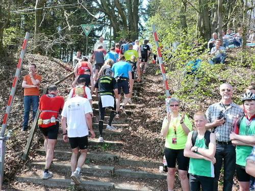 Die jetzt folgenden rund 6 km sehen im Profil absolut harmlos aus, aber die vielleicht 160 Höhenmeter gehen insbesondere zum jetzt schon fortgeschrittenen Rennverlauf gut ins Bein. Es kommt nämlich nicht nur darauf an, wie steil es ist, sondern wie erschöpft man sich schon fühlt, wie die Veranstalter sehr zutreffend bemerken. Höhepunkte dieses Abschnitts sind das Schopkebachtal und die Überquerung der Autobahn 2. Die 20 km-Marke nehme ich nach 1:50 Std. Bei km 22,5 kommen doch tatsächlich fast 100 Treppenstufen, die berühmt-berüchtigten Treppen von Lämershagen, aber so etwas kenne ich ja vom Rheinsteig zur Genüge. Was aber nichts daran ändert, daß die es echt in sich haben. Bei mir läuft es im wahrsten Sinne des Wortes hervorragend und ich jogge auch hier parallel der Treppen hoch. Nach Funk- und Aussichtsturm (Gaststätte „Eiserner Anton“ – m4y-Co-Autor Lautner habe ich vergeblich gesucht -, vierte und letzte offizielle Verpflegungsstelle) geht es wellig, aber stetig abwärts.