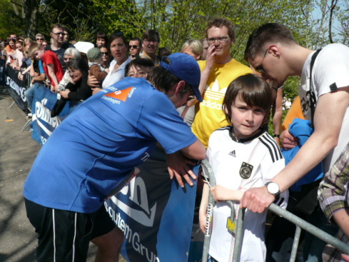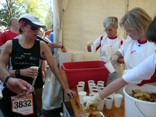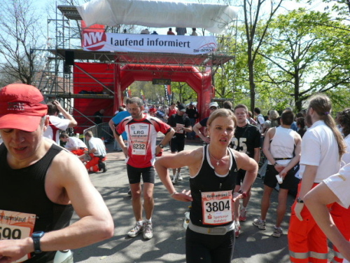 5.345 Läufer(innen) werden im Ziel gezählt, neben einigen zusätzlichen Wanderern und Walkern scheint es doch bei uns Läufern einige Ausfälle gegeben zu haben. A propos Walker: Achim Achilles, aufgepaßt! Kurz vor dem Ziel überhole ich eine geschlossene Formation seiner geliebten „Stockenten“ (Nordic Walker). Diese bewegen sich, man höre und staune, diszipliniert HINTEReinander! Liebe Leute, so vertragen wir uns. Und das sage ich ihnen auch später im Ziel und ernte strahlende Gesichter.