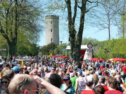 Der letzte km auf der Promenade zur Sparrenburg (restaurierte Festungsanlage, Bielefelder Wahrzeichen) kann dann doch noch ziemlich lang werden. Gut, wenn man sich nicht völlig verausgabt hat und den tollen Empfang noch genießen kann. Ich gehöre heute zu den Glücklichen, es ist die reine Freude. „Den eigentlichen Sinn des Hermannslaufes erfahren die Läuferinnen und Läufer beim Schritt über die Ziellinie, wenn sie das Glücksgefühl überkommt“ (Homepage). Der Zieleinlauf ist nämlich gem. Veranstalter – oh Überraschung! - der Sinn des Hermannslaufes.