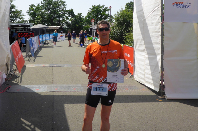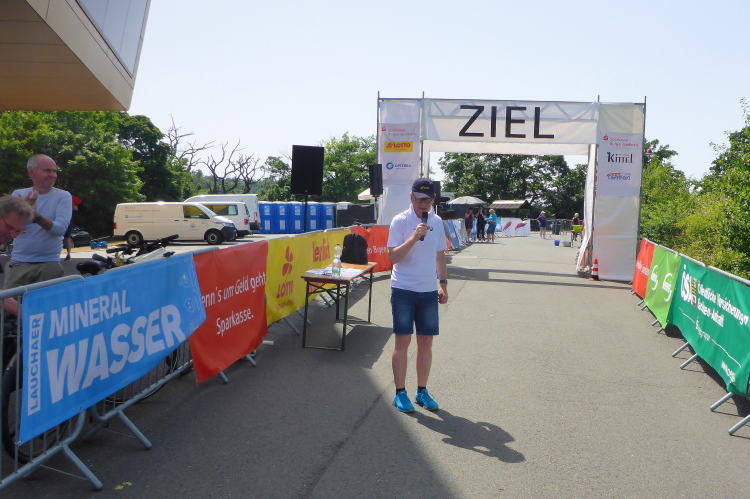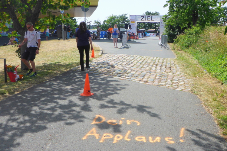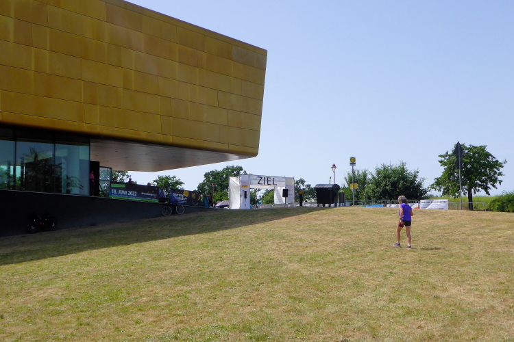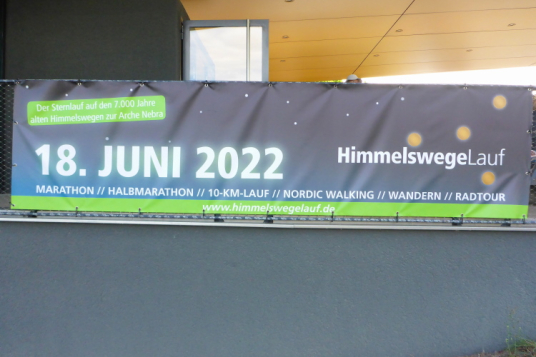 Die finale Steigung hoch zur Arche Nebra beginnt und meine Beine wollen nicht mehr. Zu meiner Freude kommt Frank von hinten, er hat die letzten Kilometer mit Herlinde bestritten. Ich gebe zwei Plätze gerne und kampflos ab. Hut ab vor der Leistung! Die letzten Meter genießen und noch ein paar Fotos schießen, dann ist es geschafft. Tanja wartet schon mit einem eiskalten Radler. Ich nehme die ersehnte Medaille für den Himmelswegelauf in Empfang und bevor das Radler verdunstet, ist es in wenigen Schlucken getrunken. Dafür habe ich die Zielverpflegung geschont. Die Medaille lasse ich mir gleich noch gravieren. Sie wird als tolle Erinnerung die einen Ehrenplatz bekommen.