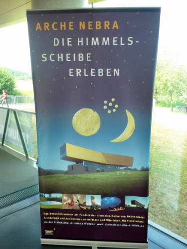 Zwei Grabräuber fanden 1999 durch Zufall auf dem 252 m hohen Mittelberg, 3 km von der nahe Naumburg gelegenen Ortschaft Nebra gelegen, einen „Blechteller“ von 32 cm Durchmesser und 2,3 kg Gewicht, der sich schließlich als einzigartiger Fund herausstellte. Es handelt sich nämlich um nicht weniger als die auf ein Alter von 3.700 bis 4.100 Jahre geschätzte, weltweit zweitälteste Himmelsdarstellung aus mit Goldapplikationen verzierter Bronze mit Barke, Sonne, Mond und Sternen. Forscher rekonstruierten damit, wie man sich in der Bronzezeit den Weltenlauf vorstellte. Man vermutet eine jahrhundertelange religiöse Nutzung, bevor das Teil, warum auch immer, vor rund 3.600 Jahren vergraben wurde. Die Originalscheibe befindet sich im Landesmuseum für Vorgeschichte in Halle. Und exakt dieses hübsche und geschichtsträchtige Teil ist der Lohn unserer Mühen, wenn auch in deutlich verkleinerter Form. Will ich haben!