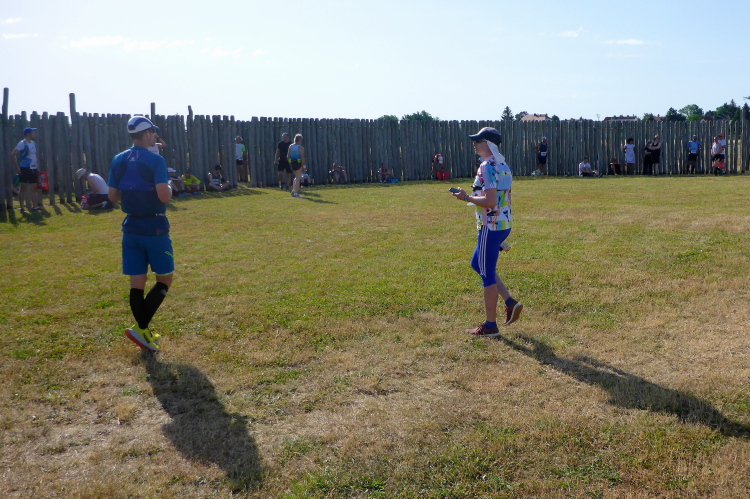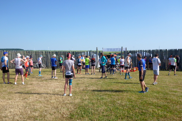 Innerhalb der Holzpalisaden versammeln sich die Läufer und suchen Schatten. Eine Startnummernabholung ist eingerichtet und die Vorbereitungen laufen. Es folgen letzte Instruktionen, einige wenige laufen sich warm. Es ist erstaunlich ruhig, die meisten haben sich eine stille, schattige Ecke gesucht und kühlen noch einmal runter. Ich schätze, dass sich rund 120 Starter hier befinden. Die letzten Infos erfolgen, man bittet darum, es beim Laufen nicht zu übertreiben und lieber nicht zu oft auf die Uhr zu schauen, damit wir alle gesund im Ziel ankommen und gefeiert werden können. Auf die Zielzeit von 6 Stunden legt man heute keinen Wert, alle werden gewertet. Für mich habe ich bereits entschieden, dass es heute eine halbe Stunde länger dauern darf als sonst. Freundliche Worte vom Landrat zusammen mit der Info, dass sich die Himmelsscheibe gerade auf Tour in Großbritannien befindet, dann gibt dieser den Startschuss.