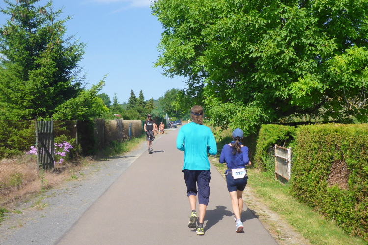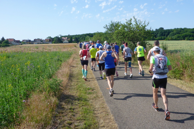 Auf dem Marathon kamen 276 Höhenmeter zusammen, die Strecke führt zu großen Teilen über den Unstrut Radweg und ist gut zu laufen. Perfekte Markierung und viele Helfer an allen markanten Ecken machen ein Verlaufen nahezu unmöglich. Schön ist, dass man sich immer an gewissen markanten Punkten orientieren kann, und im Kopf die Strecke aufteilen kann. Freude und Genuss kommen bei der Hitze natürlich etwas zu kurz, der Finisher-Stolz ist dafür umso größer.