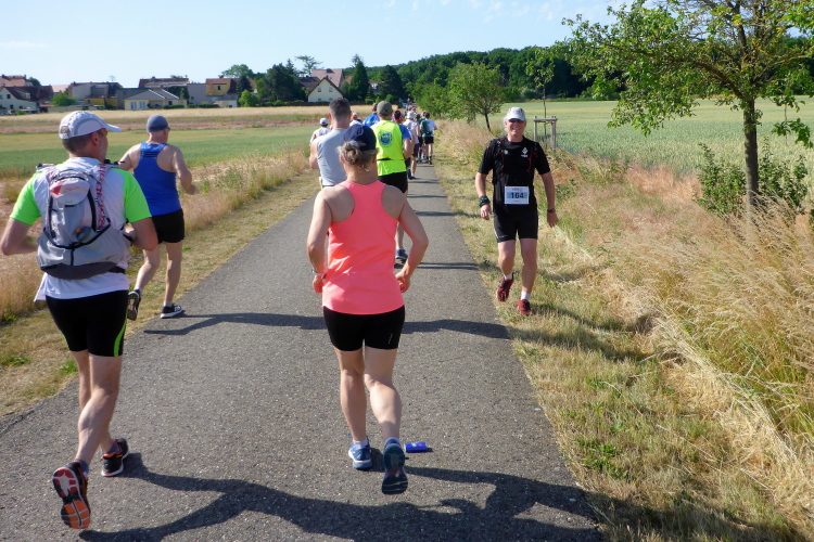 Flache Kilometer an der Unstrut entlang, dann entfernen wir uns vom kühlen Nass, es steigt durch die Felder windgeschützt an. Fühlt sich wie ein Aufguss an! Die ersten Radfahrer der Radtour kommen von hinten und sorgen für ein wenig Abwechslung. In Weihschütz der nächste VP, ein paar Häuser im Ort spenden etwas Schatten und über eine weitere Brücke verlassen wir den Ort. Schnurrstracks geht es Richtung Laucha, wo wir die Hälfte der Strecke erreichen. Hier sind um 10 Uhr die Halbmarathonis gestartet. Am Ende des Ortes hat die Feuerwehr eine Dusche aufgebaut, einfach herrlich! Meine Anfrage, ob ich diese mitnehmen darf, wird lachend verneint. Schade, denn die Abkühlung ist nur von kurzer Dauer. Inzwischen sind die angekündigten 34 Grad erreicht und wir sind erst bei 11:30 Uhr.