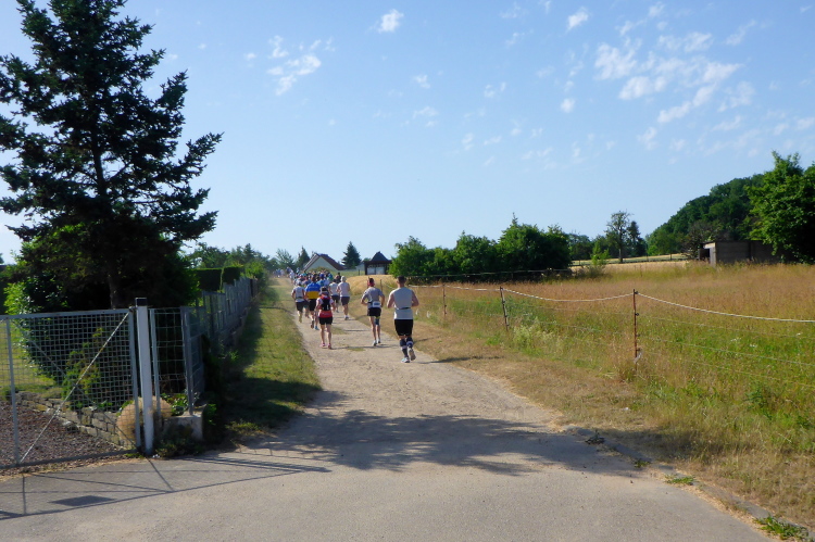 Wir laufen aus dem Palisadenring heraus und folgen einem Wirtschaftsweg Richtung Goseck. Eine Runde durch den Ort, damit es am Ende auch 42,195 km sind, und wir kommen wenige Meter neben dem Start noch einmal vorbei, dann geht’s Richtung eingangs erwähnten Parkplatz. Schließlich laufen wir auf der Straße zum Nachbarort Markröhlitz wo es die ersten Höhenmeter zu bewältigen gilt.