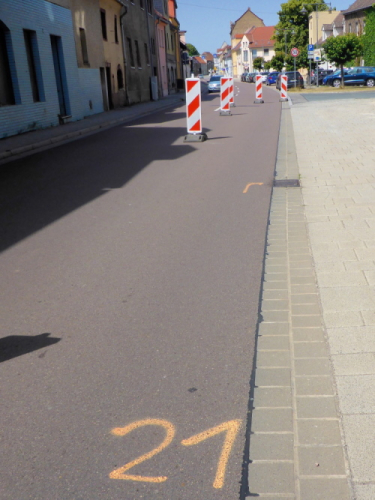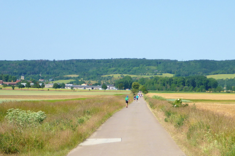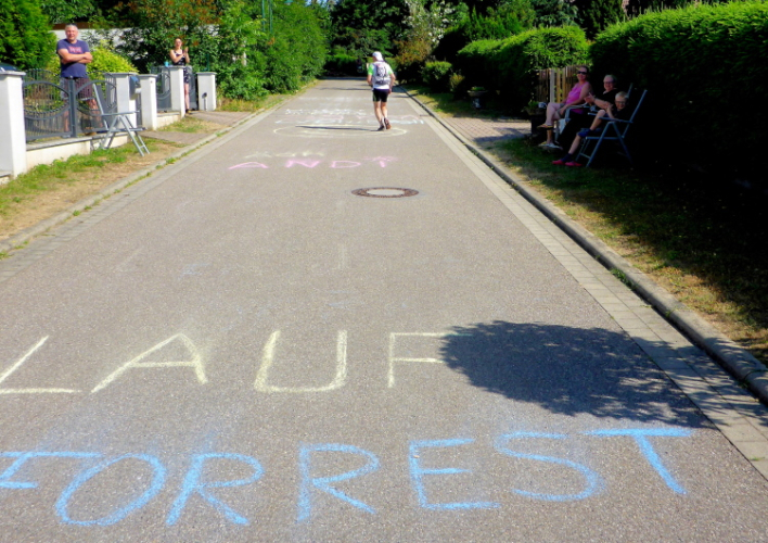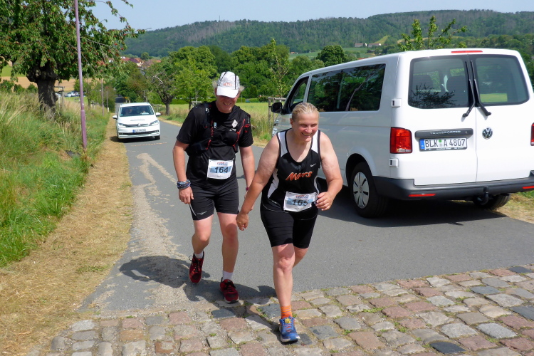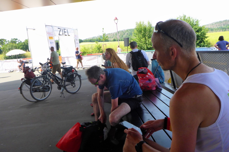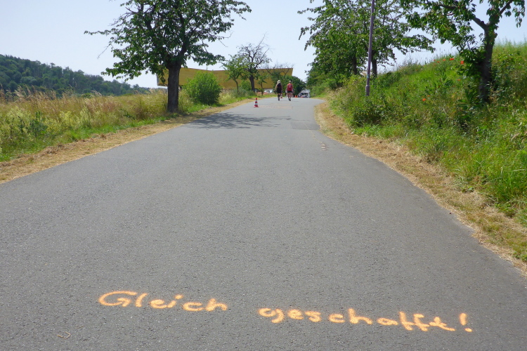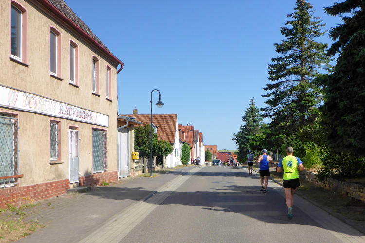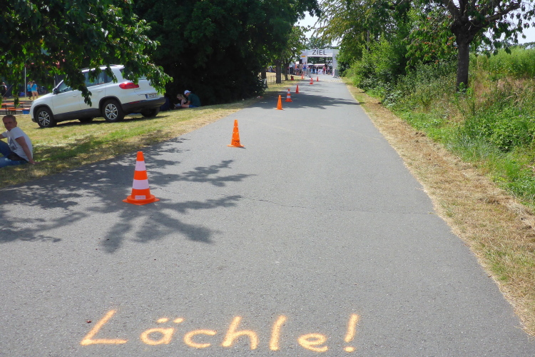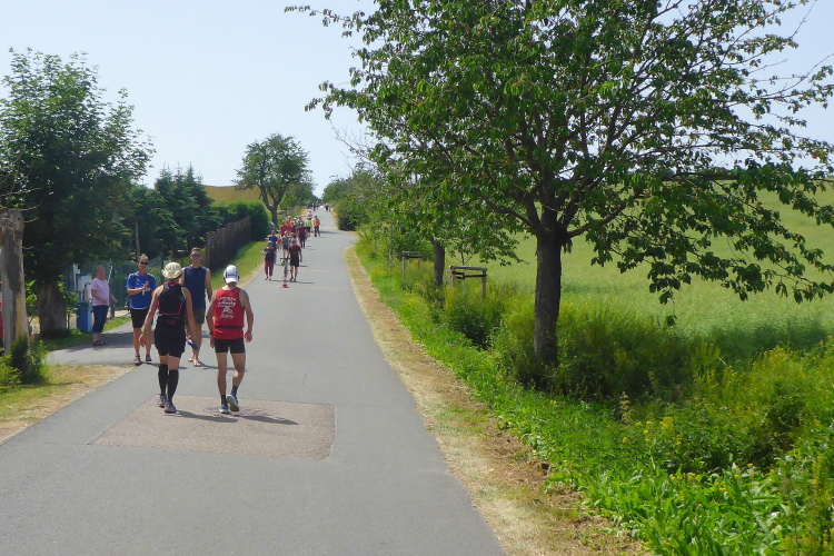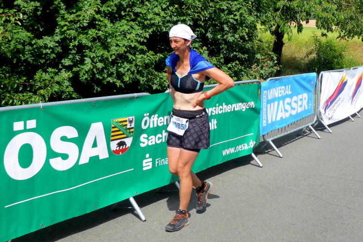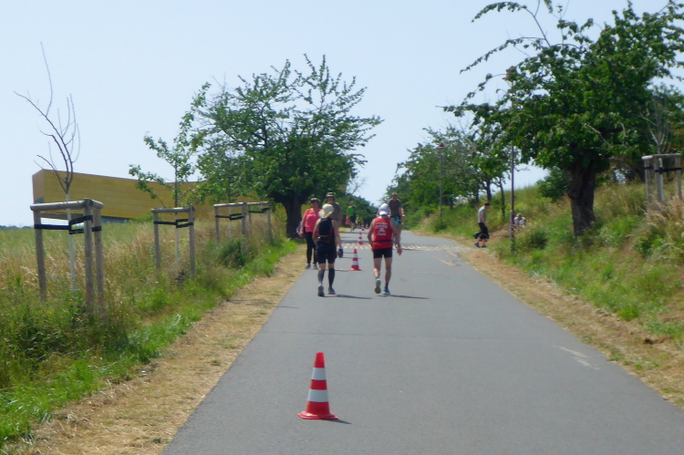Erleichterung und so etwas wie Erholung kommt bei der kurzen Abwärtspassage auf, dann geht es auf einer breiten Hauptstraße sanft ins Tal, Windstille, der Asphalt glüht, ein Teil der Straße ist Baustelle und vorbeifahrende Autos schicken Staubwolken in die Luft. Gefühlt wie in der Wüste nähert sich nur langsam das im Tal liegende gigantische Betonwerk in Karsdorf. Einmal quer durch den Ort mit den nächsten VP inklusive der nächsten Dusche.