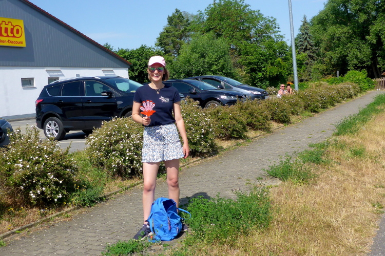 Da es sich bei dem Marathon um eine Punkt zu Punkt Strecke handelt, ist etwas organisatorischer Aufwand notwendig. Für alle ist das Ziel die Arche Nebra in Wangen. Start für den Marathon ist das Sonnenobservatorium in Goseck. Da sich die meisten Übernachtungsmöglichkeiten im abseits der Strecke liegenden Naumburg befinden, dreht sich darum der Transportservice. Morgens fahren 2 Busse von Naumburg nach Goseck, nachmittags steht mit der Startnummer die Fahrmöglichkeit mit der Unstrutbahn von Wangen nach Naumburg zur Verfügung. Der Marathon startet um 9 Uhr. Da es für Tanja erst um 10 Uhr losgeht, fährt sie mich nach Goseck, da dies genauso weit von Nebra entfernt ist wie Naumburg mit dem Busservice. Schon auf dem Weg dorthin klettert das Thermometer auf 25 Grad, bis zu 34 sind angekündigt, der Wetterdienst warnt vor extremer Hitze und die Feuerwehr erhöht auf Warnstufe 5, die höchste! Beim Ortseingang Goseck ist ein Parkplatz eingerichtet, von hier sind es noch 400 m bis zum Sonnenobservatorium, ein leichter Wind geht aber die Sonne drückt schon kräftig.