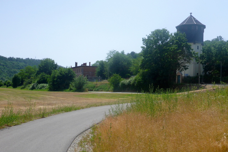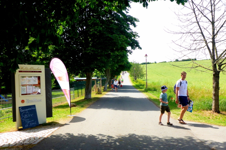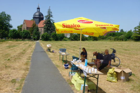 Wir lassen den Flugplatz Laucha rechts liegen, wenig später beginnt die Strecke anzusteigen, die scih wieder vom Fluss entfernt. Über eine staubige Schotterpiste kämpfen wir uns hoch nach Burgscheidungen. Es sind zwar nur 40-50 Höhenmeter, aber aufgrund der Hitze sind es unangenehme Meter. Oben angekommen, wartet eine Wasserstelle.