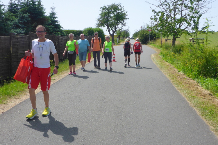 Endlich, in Wangen verläuft die Strecke am Bahnhof entlang. Hier warten 30-40 Läufer auf die Unstrutbahn nach Naumburg und es gibt noch einen kräftigen Anfeuerungsschub. Ab hier kommen jetzt ständig Finisher entgegen, die Anfeuerungen tun gut. Einer meint sogar: „Der sieht aber noch locker aus“. Wer’s glaubt ….