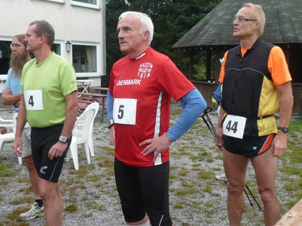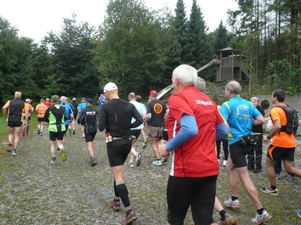 Vom Startplatz aus geht es gleich in einer Schlangenlinie über eine Rampe aufwärts. In der oberen Kurve stehen einige Läufer, die später starten werden und klatschen uns zu. Darunter sind auch etliche Dänen (Team Lene og Per), die mit einem Bus angereist sind, um hier mit einer großen Gruppe teilzunehmen.