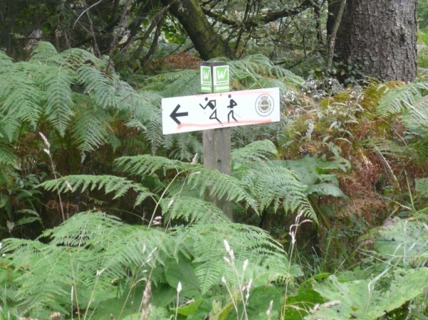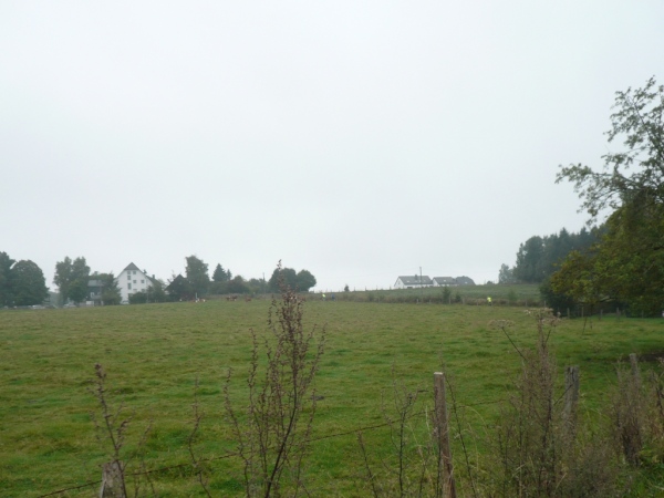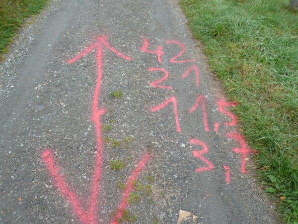 Kurz danach verlassen wir die Siedlung über eine Wiese Richtung Wald. Schon hier sind die Leuchtpfeile mit den Hinweisen auf dem Boden sehr gut zu sehen. Sie werden uns die ganze Runde begleiten. Es geht abwärts. Leider gibt es keinen richtigen Weitblick, denn es ist sehr nebelig über dem Wald.