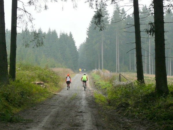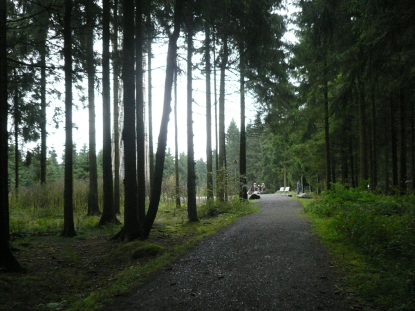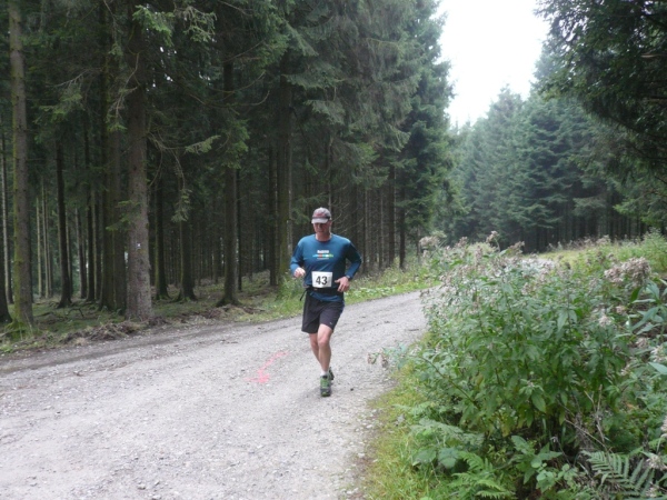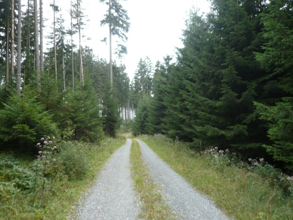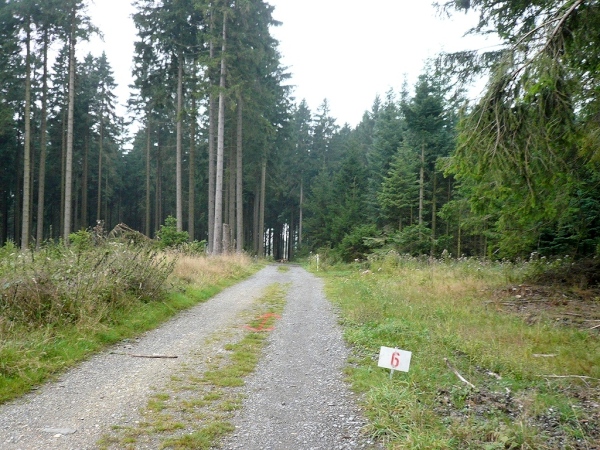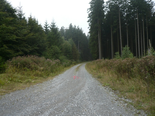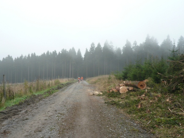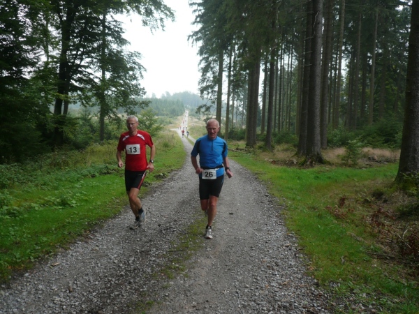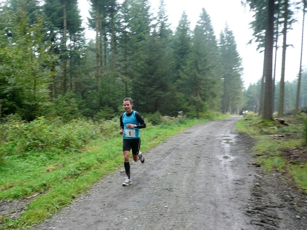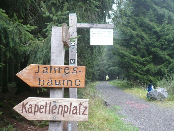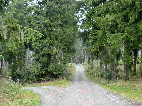 Zwischen den Quellflüsschen von Rocken und Aschersiepen geht es jetzt aufwärts in den Fichtenwald. Es kommt der erste steile und lange Anstieg zum 3km entfernten Gemeinheitskopf. Die Läuferschar zieht sich jetzt schon sehr auseinander. Da ich noch schwere Beine von meinem Marathon auf der Chinesischen Mauer habe, gehe ich lieber, um mir die Kraft einzuteilen.