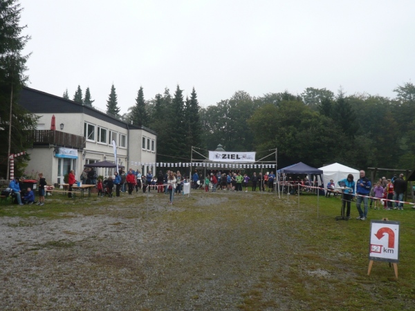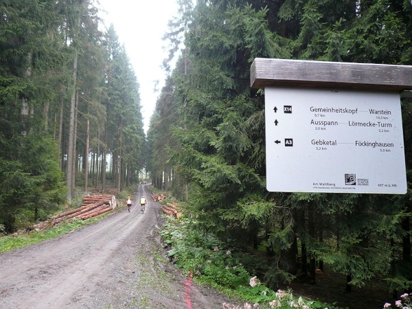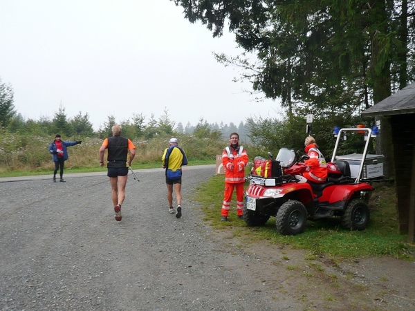 Am Gemeinheitskopf heißt es versorgen, Fotos machen und ab weiter in Richtung Warsteiner Kopf (556,9m NN). Hier laufen wir auf einer Gegenverkehrsstrecke der Marathonis bis zur Bergwacht. Die Sanitäter lachen als ich sage: „Die Bergwacht wacht über die Berge“. Sie haben heute einen ruhigen Tag.