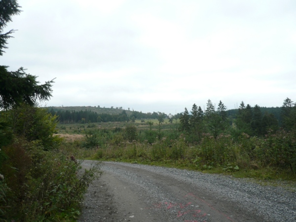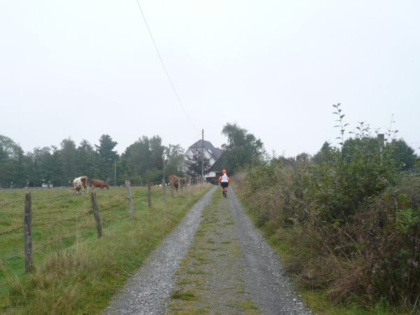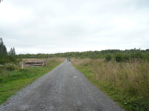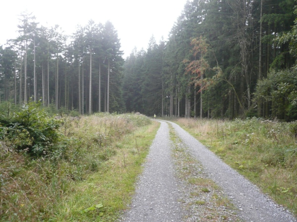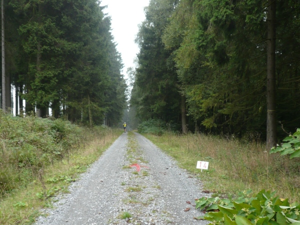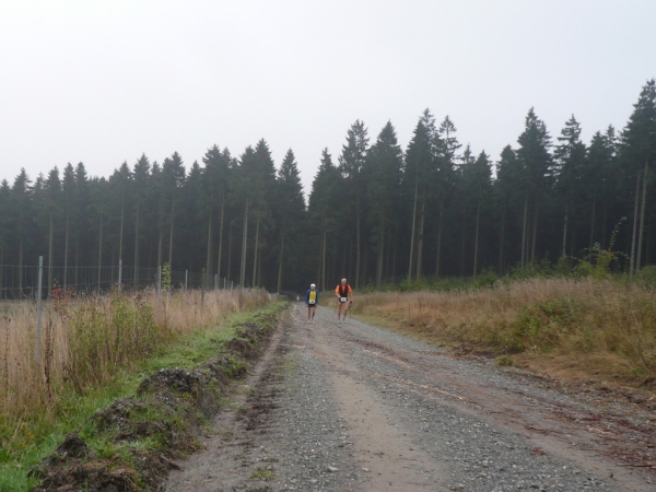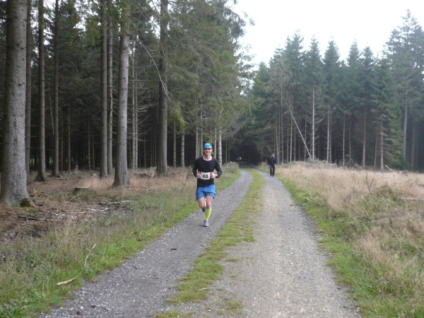 Bei km 23,9 habe auch ich die letzte lange Gemeinheit (Gemeinheitskopf) geschafft. Jetzt noch einmal in die Nuttlarer Schleife und zurück zur vorletzten Gemeinheit. Hier begegne ich weiteren Marathonis auf dem Weg zum Ziel. Vor mir liegt noch die lange Schleife durch den Wald. Der Wald ist hier sehr abwechslungsreich. Links und rechts des Plackweges gibt es meist Fichtenwald aber auch Buchenhaine, Moorbirkenwälder, Schwarzerlen.