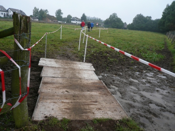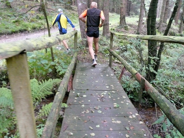 Wir sind am Ausspann. Hier oben im Wald gibt es mehrere Ausspanne, was auf ehemalige Pferdewechselstationen hinweist. Kurz dahinter biegen wir in die große Schleife ab. Es geht nun erst Mal bergab. Aber alle Läufer wissen, wo es abwärts geht, geht es auch wieder aufwärts. Hinter einer Kurve stehen wir plötzlich vor einem Bach, der jedoch zum Durchqueren zu tief ist. Während ich die Stelle fotografiere, biegen zwei Läufer rechts ab, um den Bach über eine kleine Brücke zu überqueren. Ich folge ihnen und muss feststellen, dass die Brücke elend rutschig ist und nur ganz langsam zu überqueren ist. Danach geht es wieder aufwärts über die nächsten Wellen.