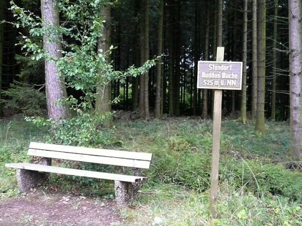 Wir kommen an der Budäusbuche vorbei, besser gesagt am ehemaligen Standort. Nach meinen Recherchen war Budäus ein französischer Gelehrter im 16. Jh. Auf der Strecke komme ich mit Sonja Kley und ihrem Mann Detlef, der sie heute auf dem Fahrrad begleitet, ins Gespräch. Wir stellen dabei fest, dass wir den Kyffhäuser Bergmarathon zusammen gelaufen sind.