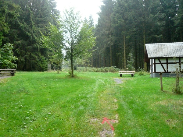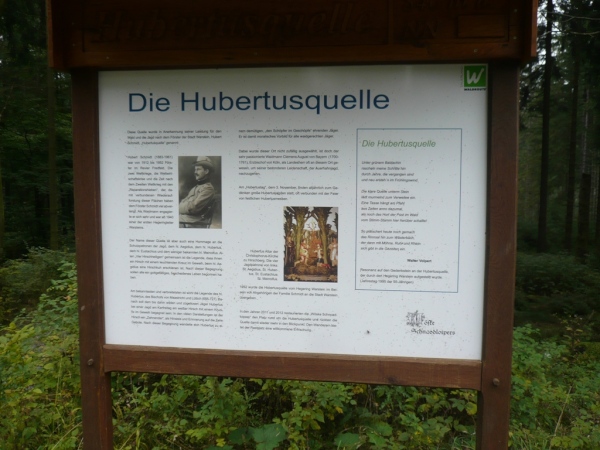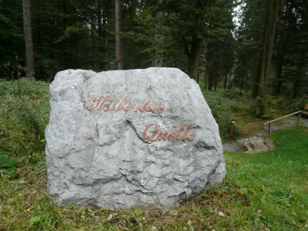 Es geht mal wieder bergab bis zu einer Spitzkehre in die wir einbiegen müssen. Kurz danach die nächste Versorgungsstelle. Jetzt geht es am Hessengraben über lange gerade Waldwege. Kurz vor km 14 kommen wir an der Hubertusquelle vorbei. Die Quelle wurde nach dem Förster Hubert Schmidt vom Revier Fredfeld benannt sowie auch nach dem Schutzpatron der Jagd dem Hl. Hubertus. Im letzten Jahr wurde der Platz um die Quelle von den „Wöske Schnoadloipers“ restauriert und als Rastplatz für Wanderer hergerichtet.
