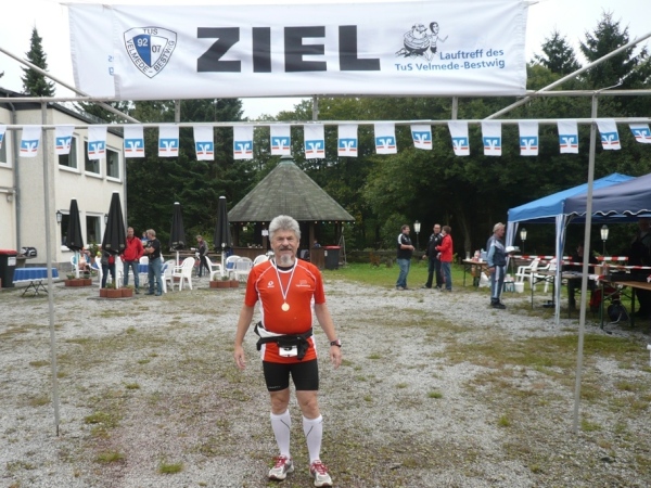 Zu meiner Überraschung bin ich auch noch 1. in der M 60. Während ich mich mit Volker Fröde, Sieger M65 vom Tus Hamborn-Neumühl unterhalte, warten wir noch auf den letzten Läufer, der deutlich länger als 6 Stunden, was ja das Limit ist, unterwegs ist. Solange wird auch das Zielbanner wird abgebaut. Das ist sportlich äußerst fair. Bei soviel Liebe zum Marathoni wünsche ich den Bestwigern, dass in den nächsten Jahren mehr zu diesem herrlichen Landschafts- und Waldmarathon kommen. Die Strecke ist nicht leicht, dafür bekommt man Natur pur.