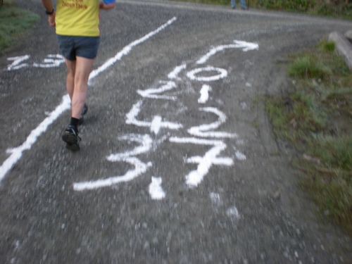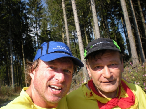 Nur 38 Marathonläufer treten an, einer weniger als am Vortag in Rothenburg an der Fulda. Zwei Runden müssen gelaufen werden. Die Strecke ist wie ein große Schleife, der Knotenpunkt ist der Gemeinskopf, er könnte auch Fieskopf heissen, denn hier müssen wir 6 mal hoch.
