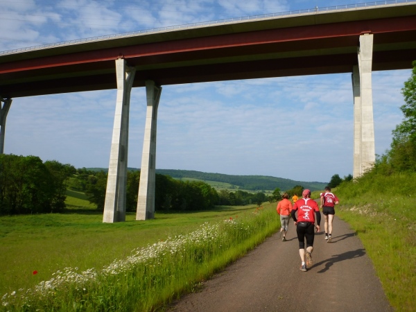 Nach einem kurzen Aufschwung in Haina wird der Kurs etwas gefällig, denn er führt hinunter ins romantische Nessetal. Die Nesse ist ein rund 50 Kilometer langes Gewässer, das unweit von Erfurt entspringt und das später in die Hörsel einmündet. Wir verlassen später den Wald und sehen vor uns die 380 Meter lange Talbrücke Nessetal der Autobahn 4, die im Rahmen des Projektes Deutsche Einheit in diesem Bereich neu trassiert und gebaut wurde. Wie bei manchen anderen Autobahnneubauten und -modernisierungen holte sich der Bund das Geld von der Privatwirtschaft. Via Solutions Thüringen hat hier den Bau übernommen und erhält im Gegenzug für 30 Jahre die anfallenden Mautkosten. Ob sich das auch rechnet, wird sich zeigen.