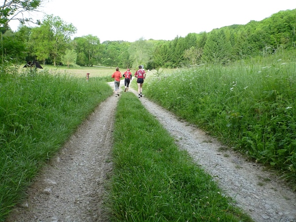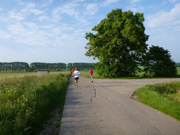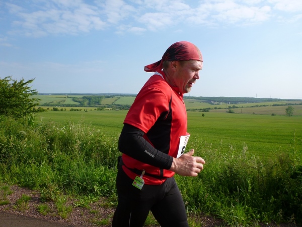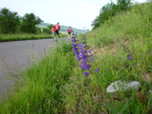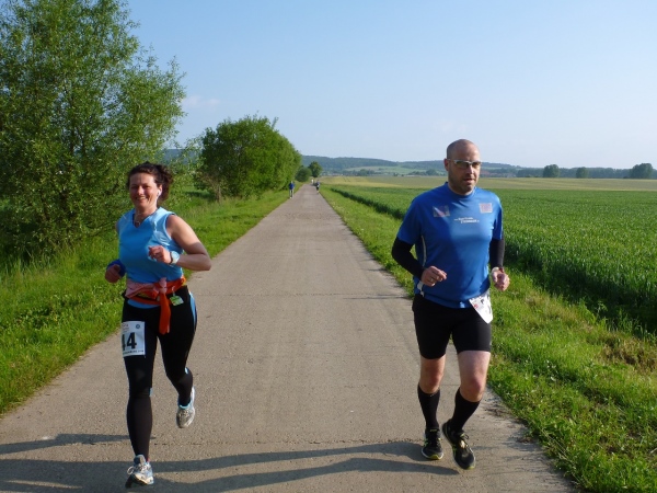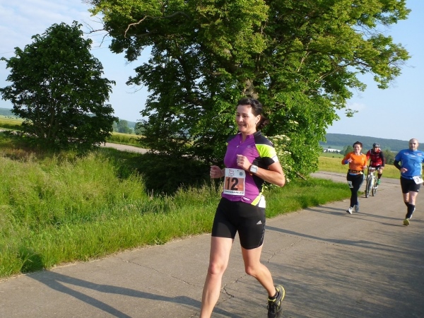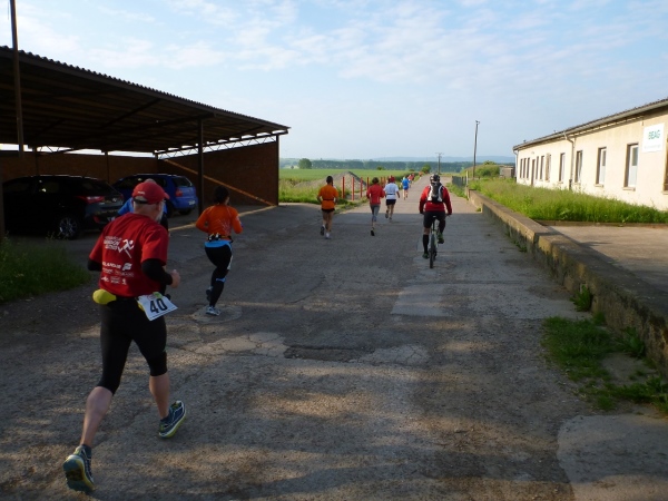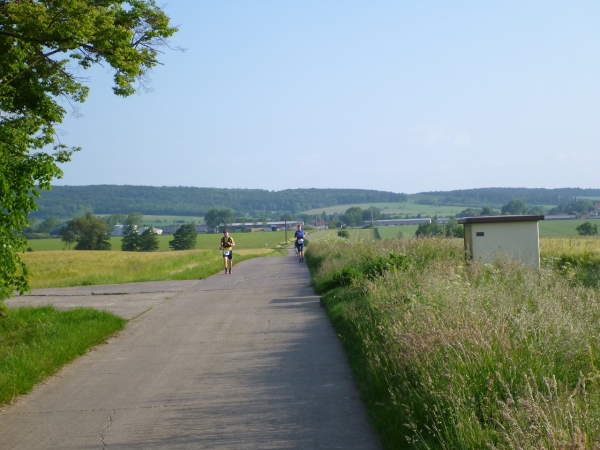 Behringen hat heute rund 1600 Einwohner und ist seit 2007 Ortsteil der Gemeinde Hörselberg-Hainich. Unser Kurs führt zu Beginn durch einige Ortsstraßen, die durch Feuerwehrkameraden gesichert sind. Wir verlassen Behringen auf der Bahnhofsstraße an der Milchviehanlage vorbei Richtung Süden. Zu Beginn noch asphaltiert und recht eben, endet die Befestigung und eine Schotterpiste bringt uns nach Haina. Das Läuferfeld hat sich gehörig auseinander gezogen. Von den Run & Bike Paaren liegt eines noch hinter uns. Ich bin mir allerdings nicht sicher, ob diese auch zu uns gehören. Wir können die erste Wasserstelle aufsuchen.
