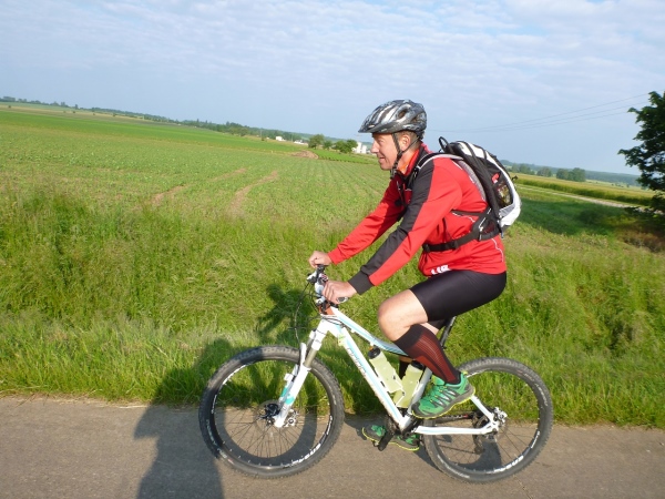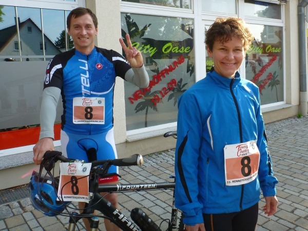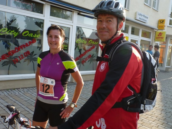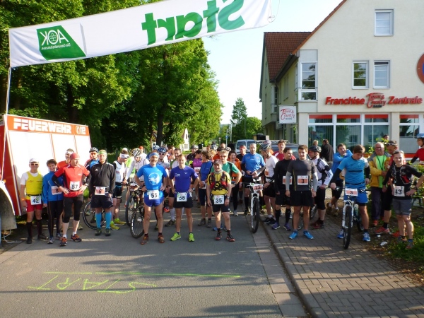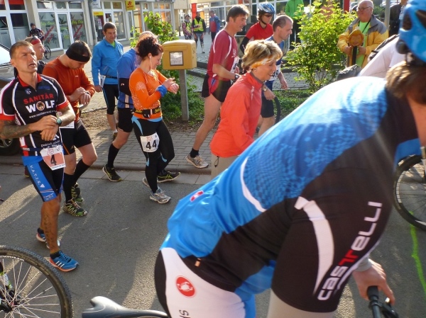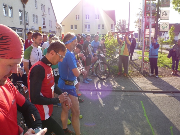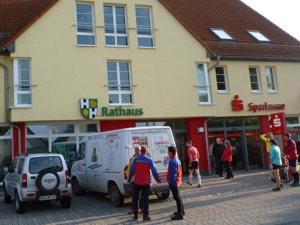 Am nächsten Morgen sind die Temperaturen fast noch einstellig, aber die Sonne strahlt schon kräftig, als ich meine Karre auf dem neben dem Rathaus liegenden Parkplatz eines Supermarktes abstelle. Die Startnummern werden im Rathaus gerade ausgegeben. Drangvolle Enge herrscht hier nicht, denn das Gros der Sportler wird auf die Halbmarathonstrecke und auf die zehn Kilometer gehen. Knappe 50 Teilnehmer haben für den langen Kanten und den „Run & Bike“ gemeldet.