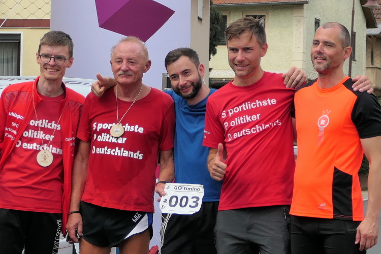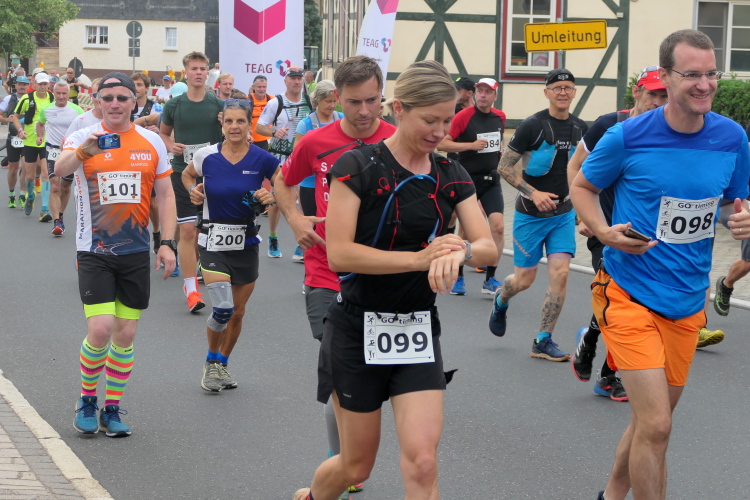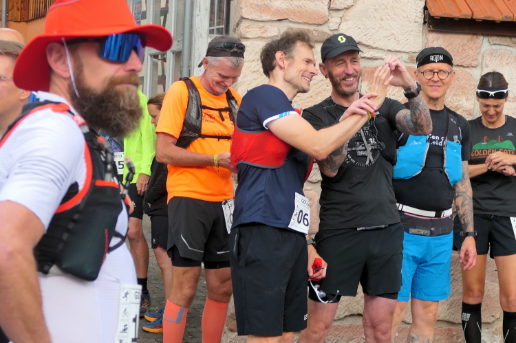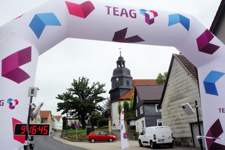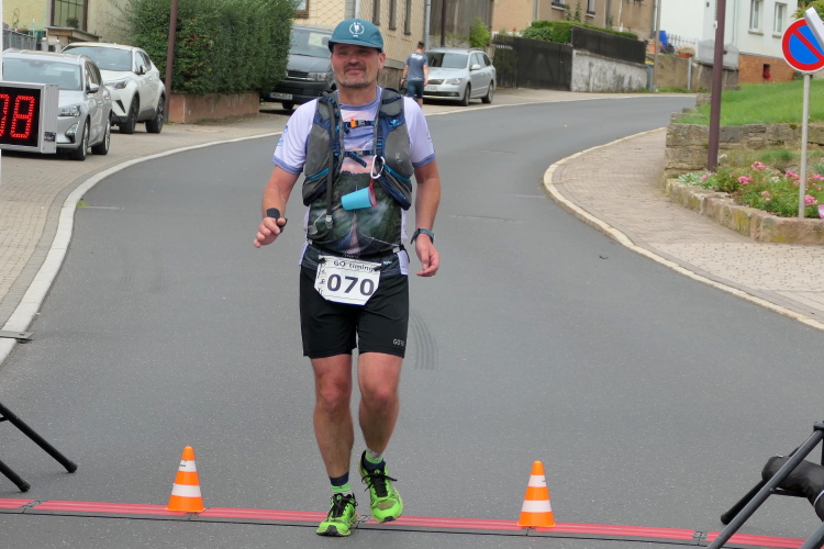 Bei der offenen Wiese vor Gumpelstadt genießen wir die Aussicht, dann ist auf dem unebenen Geläuf noch einmal Aufmerksamkeit gefragt. Ja nicht noch stürzen, so kurz vor dem Ziel. Im Ort müssen wir tatsächlich noch ein paar Meter bergan, bevor die Straße zum Ziel an der Georgskirche zurückführt. Da können wir die letzten Meter noch einmal locker laufen. Als Gruppe erreichen wir glücklich das Ziel und nehmen Medaille und Urkunde stolz entgegen.